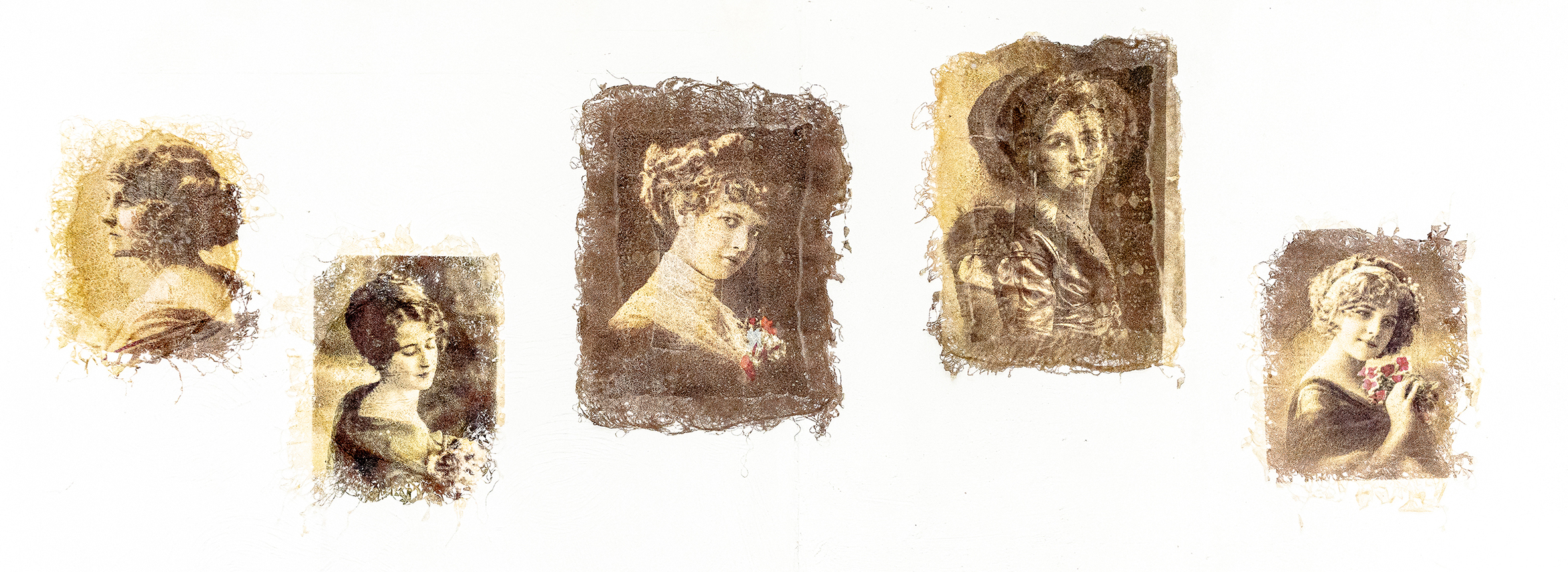 Dye Sublimation Print, Silk Shantung Fibres, Found Objects, Starch Fibre technique Installation of five artworks approx. 300cm in length - 1. (70cm x 50cm) 2. (80cm x 60cm) 3. (90cm x 60cm) 4. (90cm x 60 cm) 5. (70cm x 50cm)