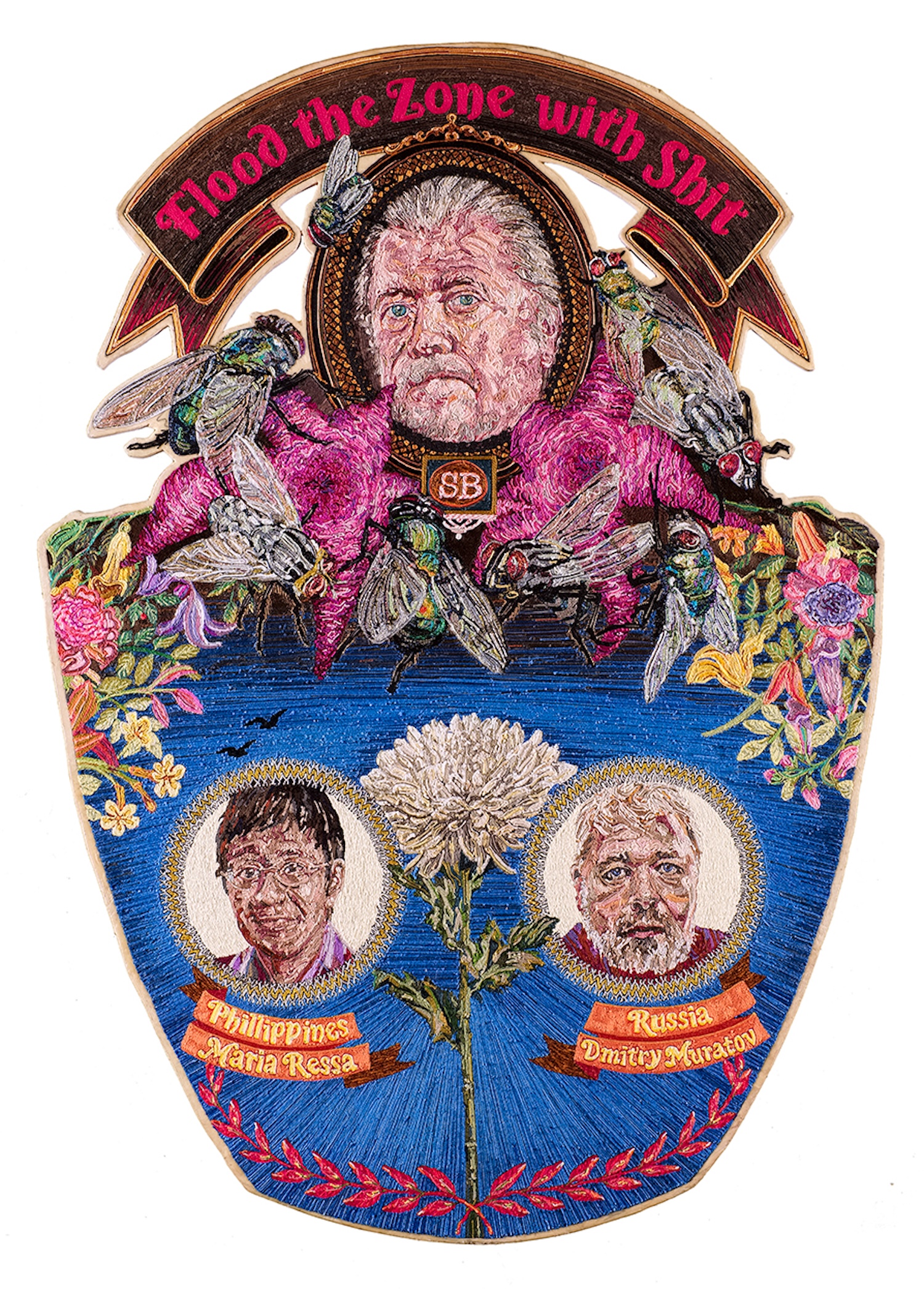 The people of the United States and the world now live in a time of public mistrust, false news, propaganda, and encouragement of ignorance. Social media has contributed to this situation. Funds for investigative journalism and local news have dried up leaving people essentially alone with outlets like Russian State TV and Fox News. In this environment, Steve Bannon, an influential far-right political provocateur and conspiracy theorist advocates for the violent overthrow of democracies and his message spreads. Bannon holds racist, antisemitic and white supremest beliefs and believes the way to undermine truth is to “Flood the Zone with Shit”. In 2021 journalists Maria Ressa of the Philippines and Dmitry Muratov of Russia were awarded the Nobel Peace Prize"for their courageous fight for freedom of expression in the face of authoritarian governments”. Ressa and Muratov represent all journalists around the world who bring the truth to light and power to account - despite personal danger and sacrifice. They are true heroes, noble, and deserving of admiration.