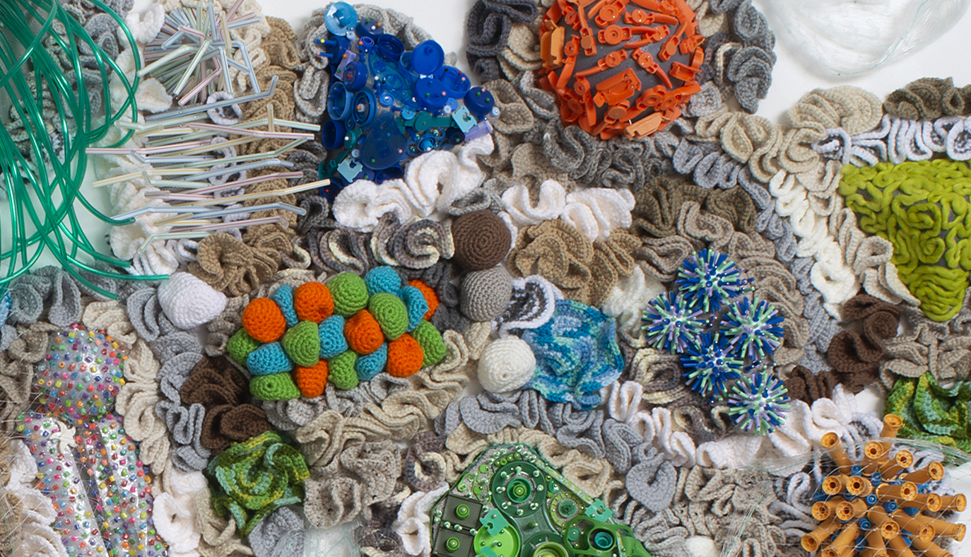Plastic Reef shows the effect of humans on the world's coral reefs. I use this and my other coral reef pieces to talk about the cascade that starts with burning of fossil fuels causing global warming, which increases the temperature of the ocean. This causes the death of the algae zooxanthellae which in turn cause the corals to die. Instead of the brilliant colors of the coral reefs, they become white, or bleached. I made coral reef organisms out of all colors of plastic to highlight human consumption. Are we trading our natural coral reefs for our dependence on plastic?