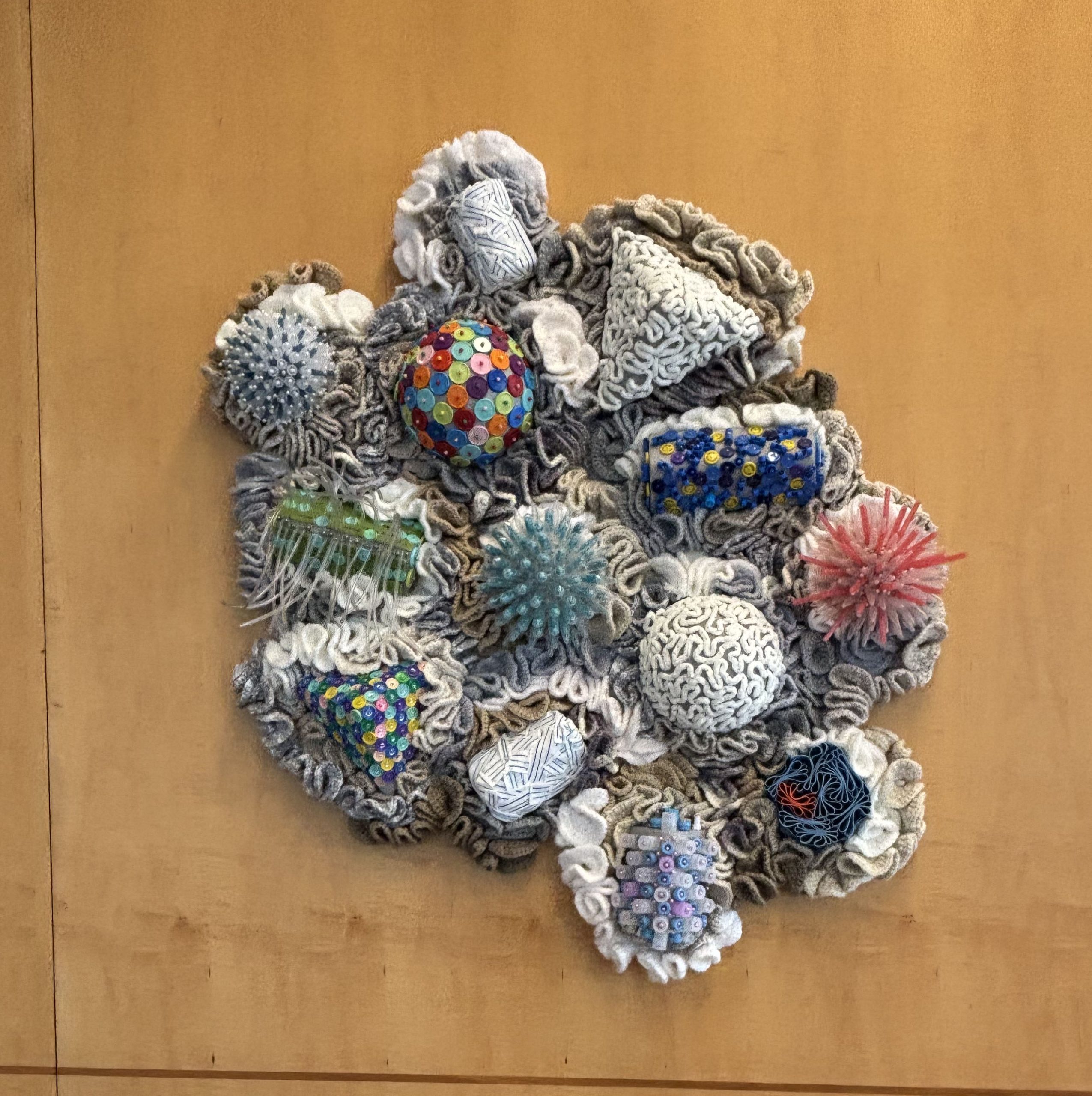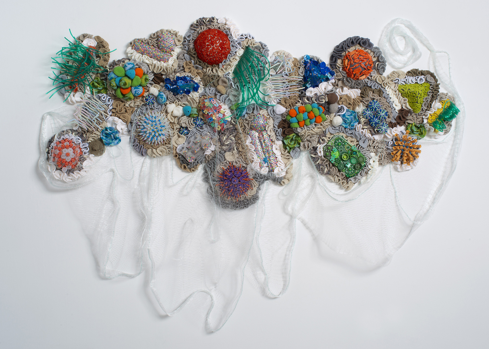 'Plastic Reef: UCSF' is the latest in my series on bleaching of the coral reefs. It is the anchor piece for my exhibition 'Big Oil, Global Warming, and a Calculated Stitch. 'See 'Plastic Reef' for description. All the plastic used for this work was sourced from University of California San Francisco Office of Sustainability, Laboratory Services, and Post-Lung Transplant Clinic