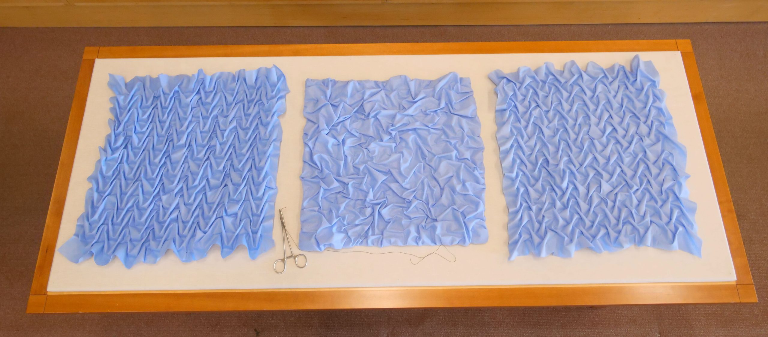 'Sutured' is made from disposable surgical drape and stitched with surgical tools: surgical silk suture with a curved needle and needle holder.