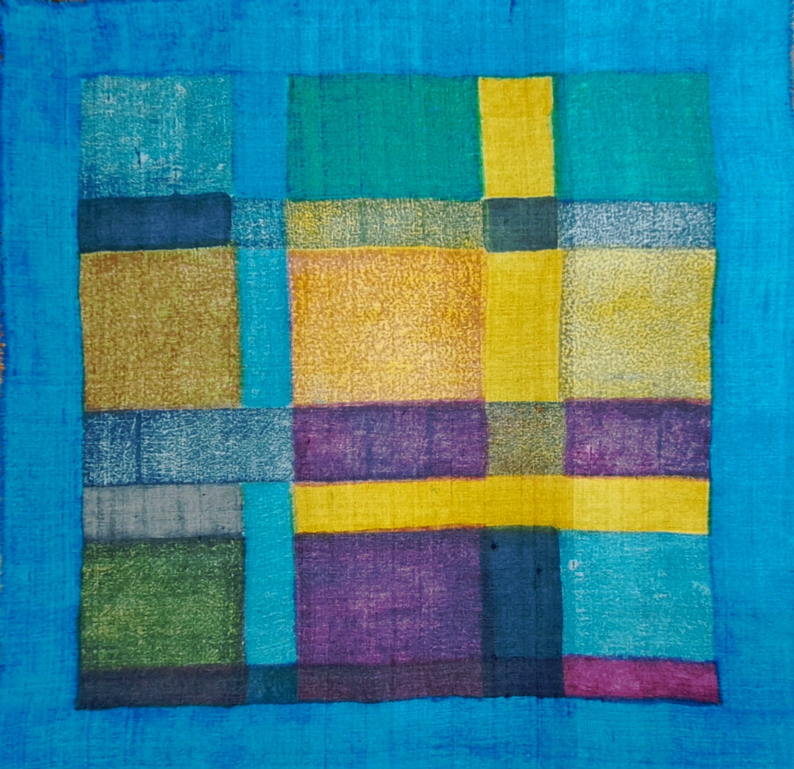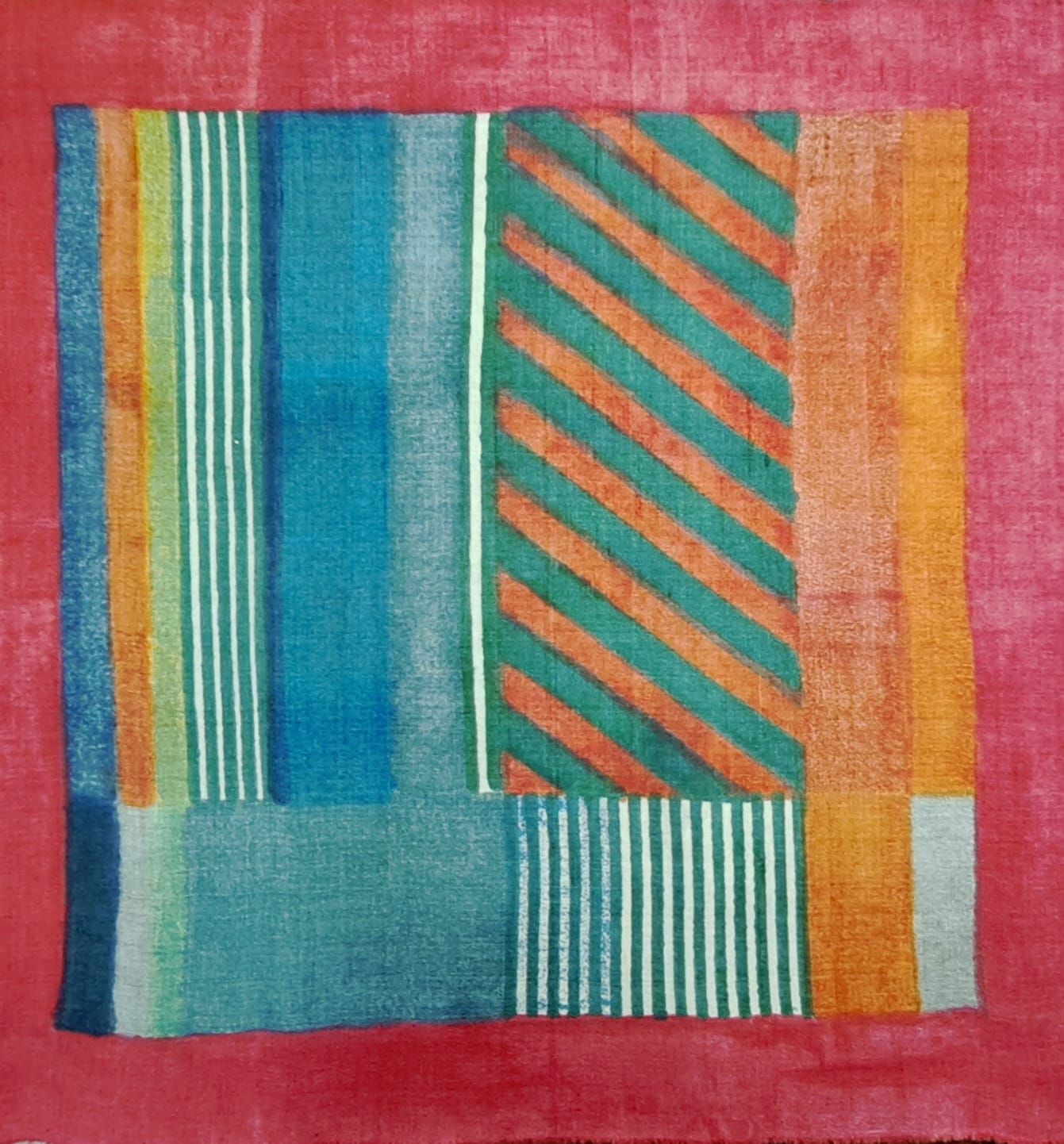 natural wild silk ,handpaint+roller+wooden carved block stamping ,all in layers with AZO free colours. 38cm x 38cm