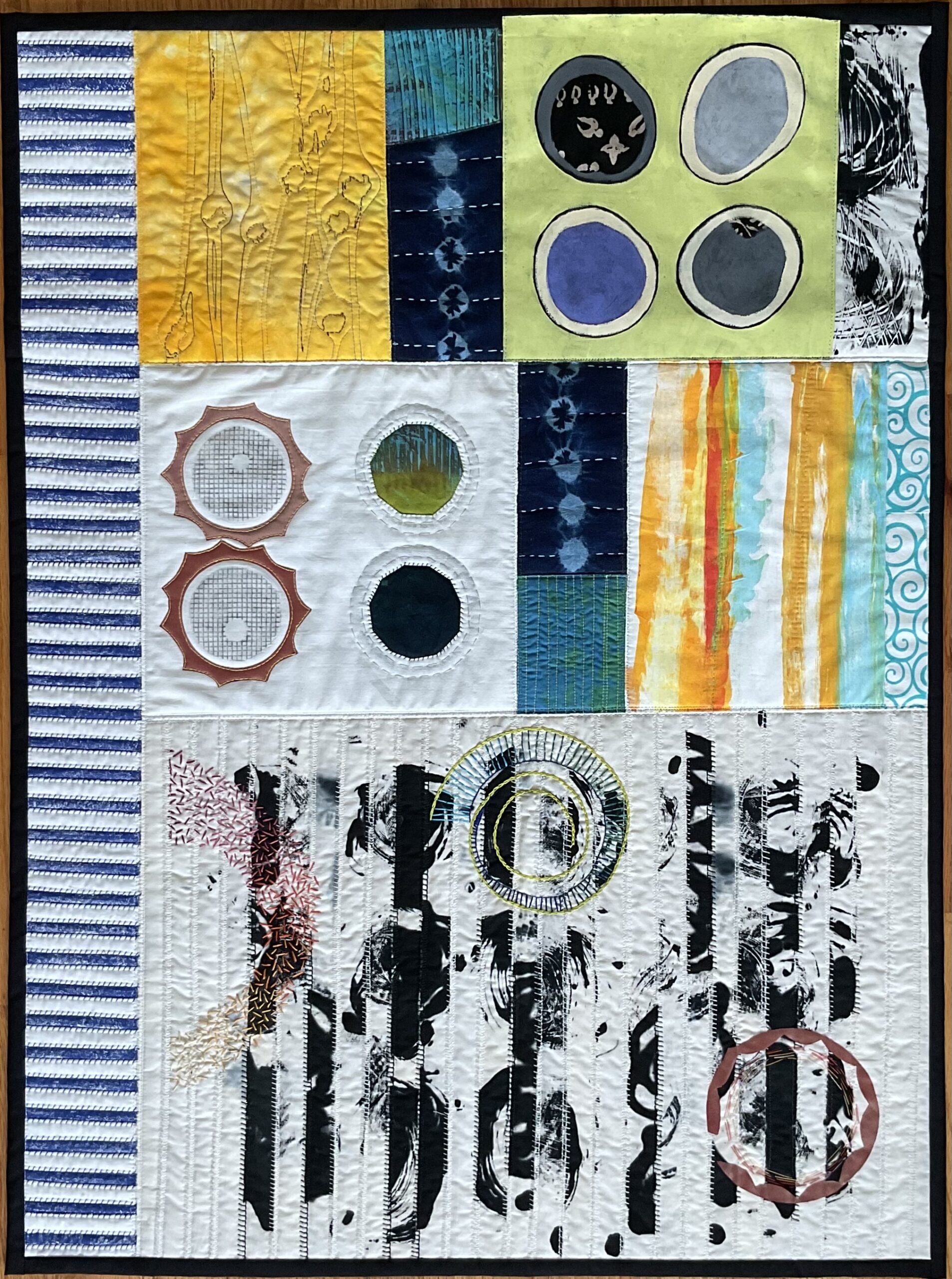Hand-dyed cotton, commercial cotton, gesso, hand-dyed cotton and Sulky poly-monofil threads 8 x 6 inches