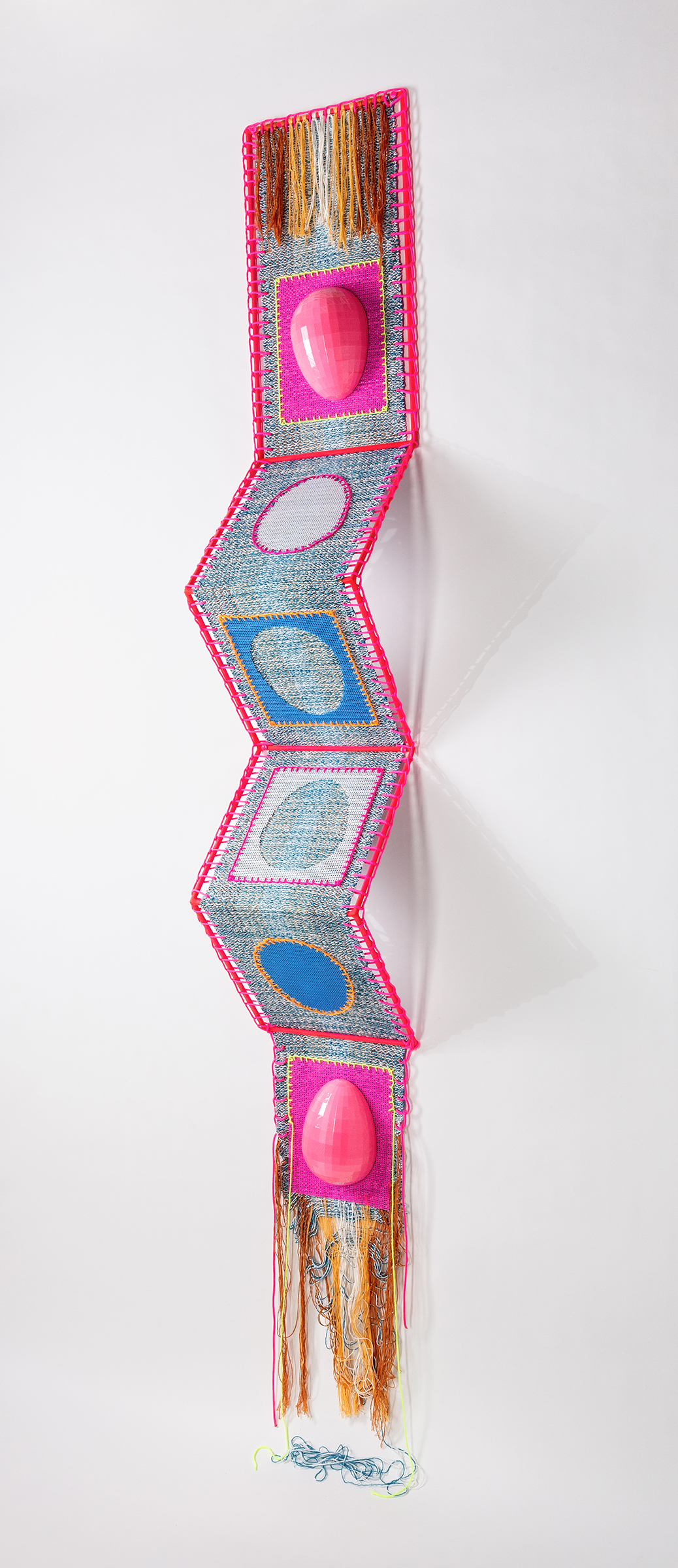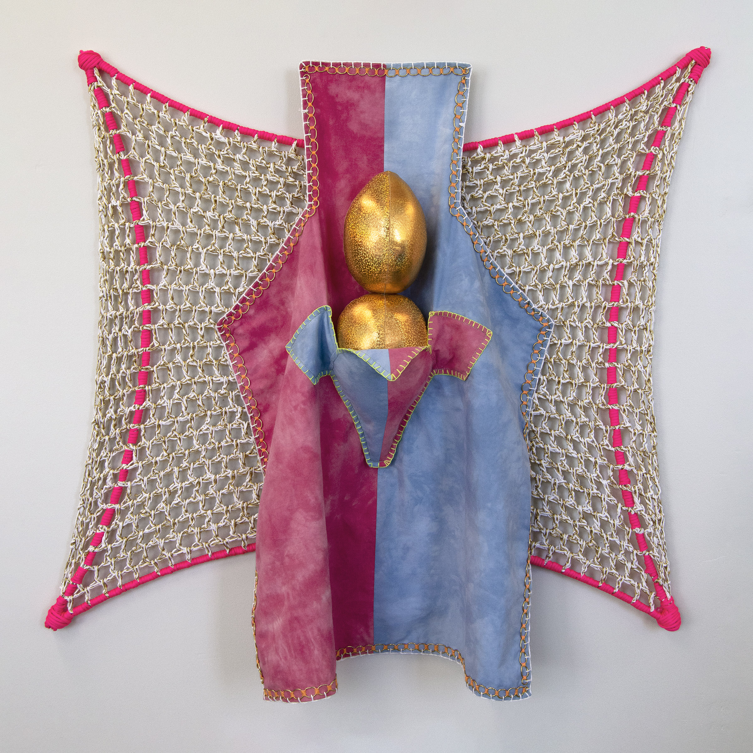This piece references Penelope's 'endless shroud' in the Odyssey merged with a structure that alludes to Brancusi's 'Endless Column.' The plastic canvas and 3D printed eggs symbolize fertility, but also represent the faces of Penelope's suitors. I’m constantly thinking about the expectations surrounding womanhood, specifically partnership and fertility. In my experience, others assume I won’t find happiness without marriage or children. It’s funny because those same people will also make statements like “never get married” or “don’t have kids.” I love how Penelope tricked her suitors into thinking she was going to remarry one of them when she had no intention of doing so. Yes she was beautiful, but they were mostly after her money and power. “Gold diggers” are usually stereotyped as female, but in this case it’s the males assuming that role.