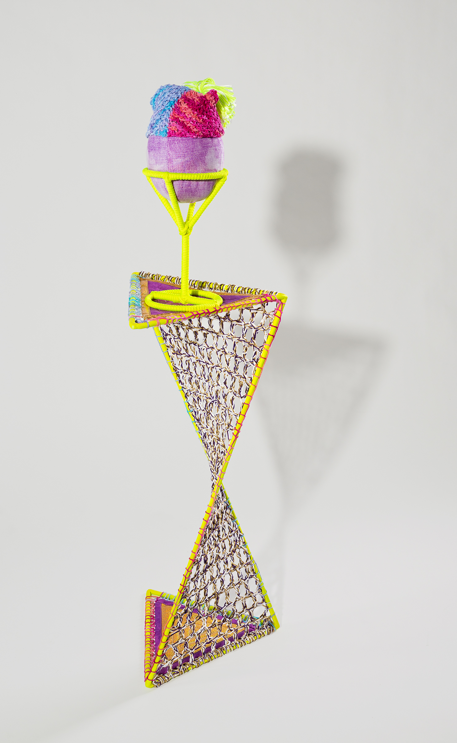 cotton and acrylic yarn, tinsel cord, paracord, mx dyed cotton fabric, foil lined cotton fabric, polyfil, steel 37" x 37" x 7"
