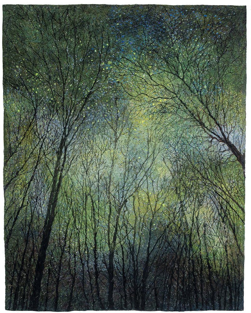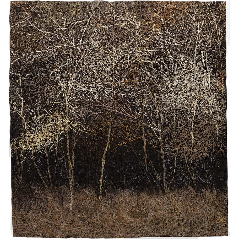 “… Those who knew/ what was going on here/ must make way for/ those who know little. And less than little./ And finally as little as nothing. In the grass that has overgrown/ causes and effects,/ someone must be stretched out/ blade of grass in his mouth/ gazing at the clouds.” -by Wisława Szymborska (1923 - 2012, 1997 Nobel Laureate) Inspired by the poem written by Wisława Szymborska, my work entitled The End and The Beginning contemplates on the true meanings of life, humanity, and harmony. My work emerges from the pain and chaos of a broken world, the death from wars and plagues. While I was working on it, I wove grass and the color green as a symbol of hope into the quilt surface, which was composed of intricately entangled threads. Thus, this piece does not speak so much on pain, sorrow, or the absurdity of life, but rather of healing, recovering, newness, and the inner joy of life.