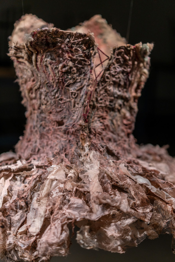 handmade gampi paper fabric, steel wire, tulle, yarn, embroidery thread, adhesive, flax, abaca, and kozo paper pulp, black walnut dye, seaweed, red wine, and watercolor. 24" x 26" x 27"