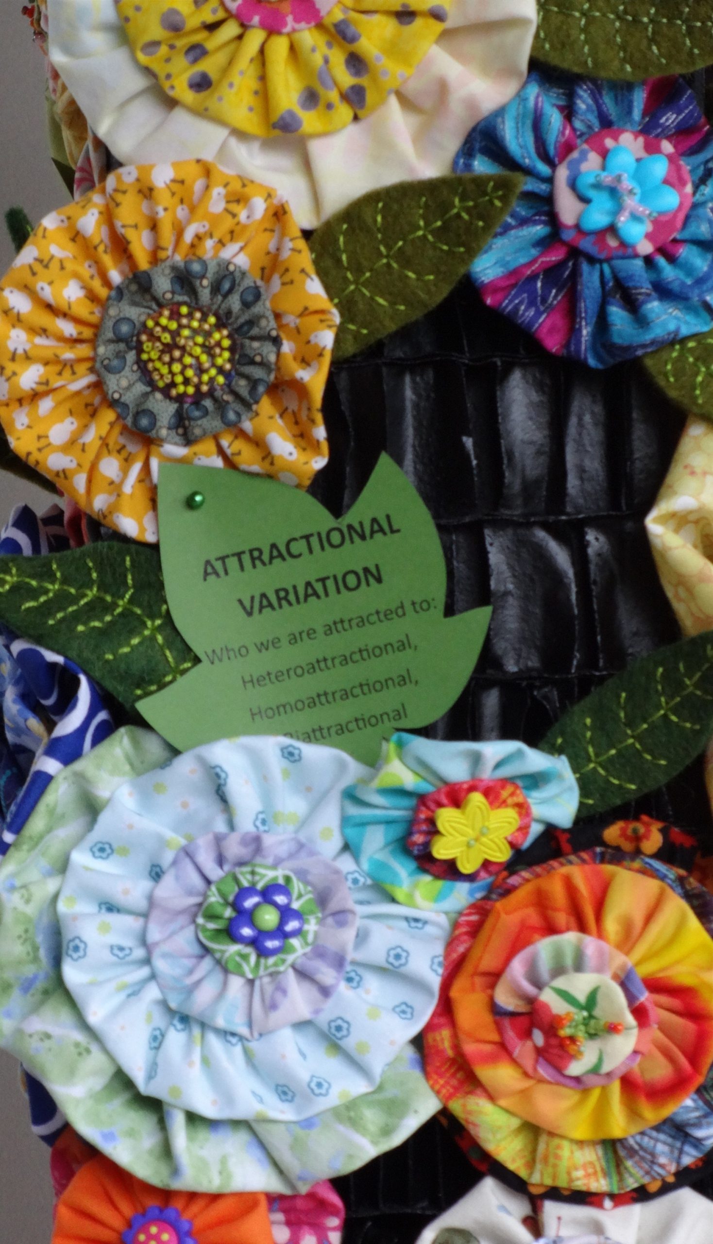 This is the first component of an installation-in-process that arose out of a need to help me understand the terms we use to describe ourselves sexually. As an elder I found terms, that usually appeared in a medical or psychological context, now confronting me on application forms. Plural pronouns, applied to individuals felt awkward at first. I wanted to respect people in my community by learning the meaning of the words and how to use them correctly. I chose to share what I learned in a way that would be non-threatening. Fabric yo-yos are a traditional fiber technique often used to make toys, quilts, household items. I make them in various diameters, stack them up, and use them symbolically to represent the sexual variation within the human race. I include information on paper leaves on each side of the sculpture. My research is ongoing and at least 5 more sculptures will follow. Understanding how amazingly varied we are within our human existence may help us see the world with more empathy and compassion.