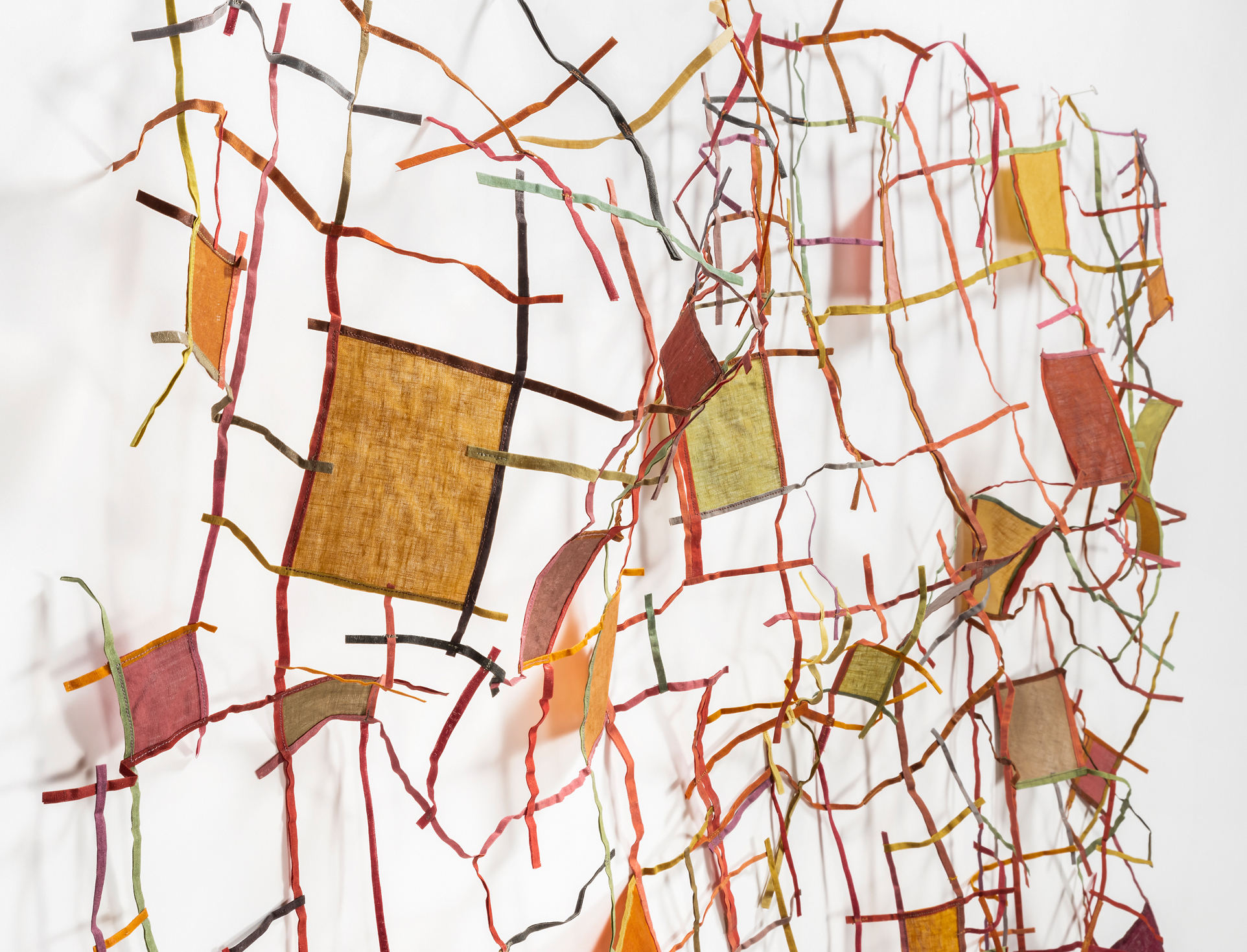 Close up of sculptural wall-hanging composed of botanically dyed, stiffened linen strips with set-in, machine-stitched, solid panels turns and twists away from the wall, creating cast shadows and dimensionality.