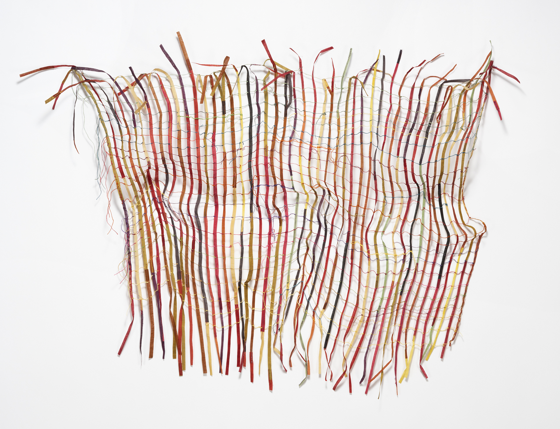 Artist-dyed and stiffened linen has been cut, folded into strips of varying widths and length, handwoven together in a large rectangle, secured by machine stitching or pva glue, then folded and cut apart with portions of strips removed and added in the deconstruction process. Selvage strips indicating the name of the tannins used, plant dyes, and overdyes have been included throughout the composition.