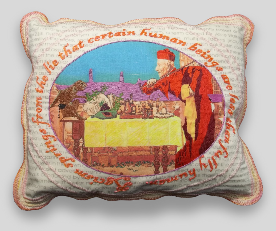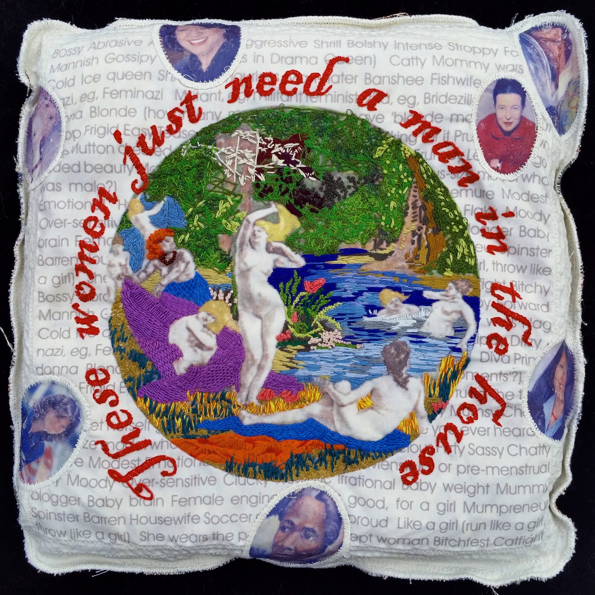 Ink jet, fabric pen, embroidery floss, muslin, poly fill, upholstery fabric, thread 15" x 15" x 3"
