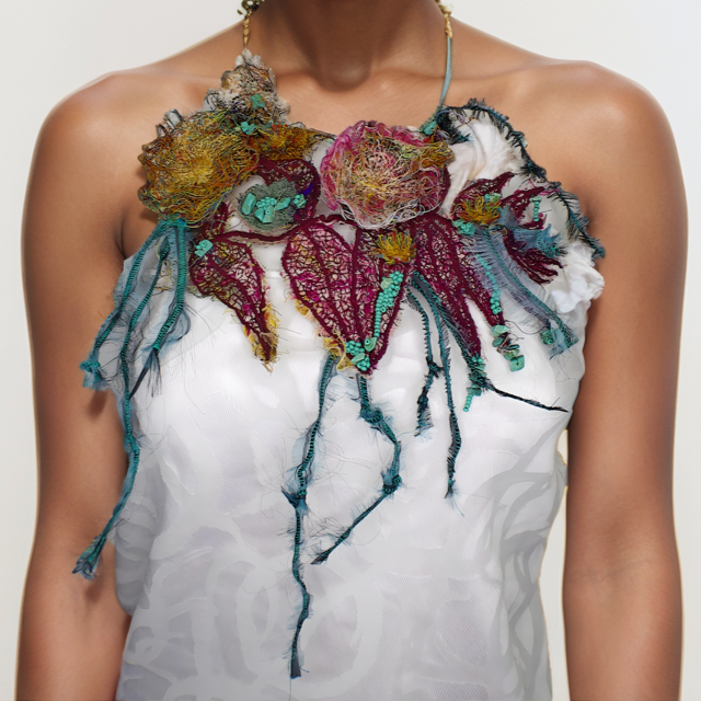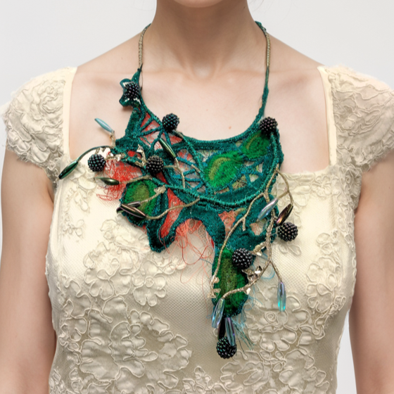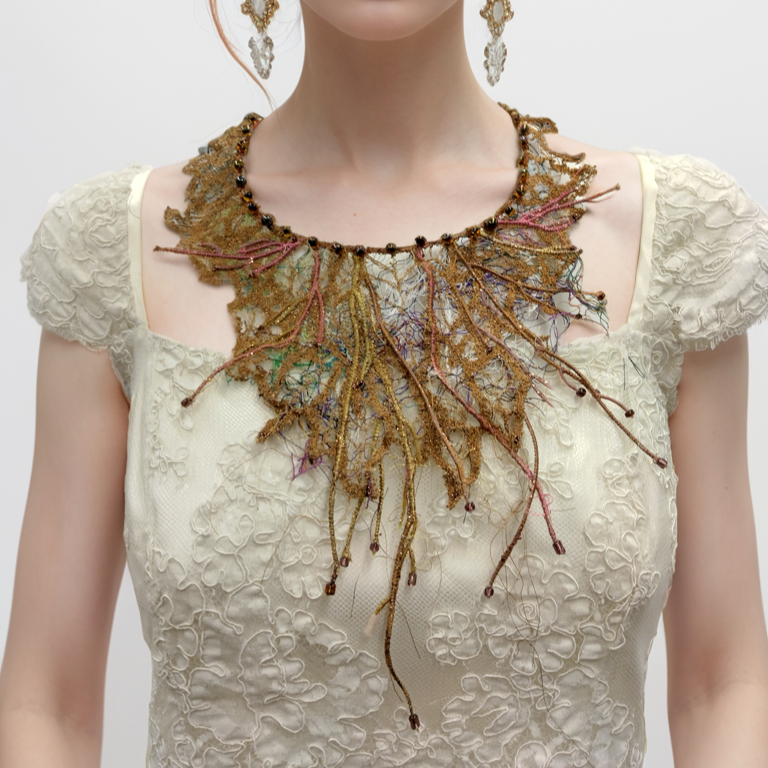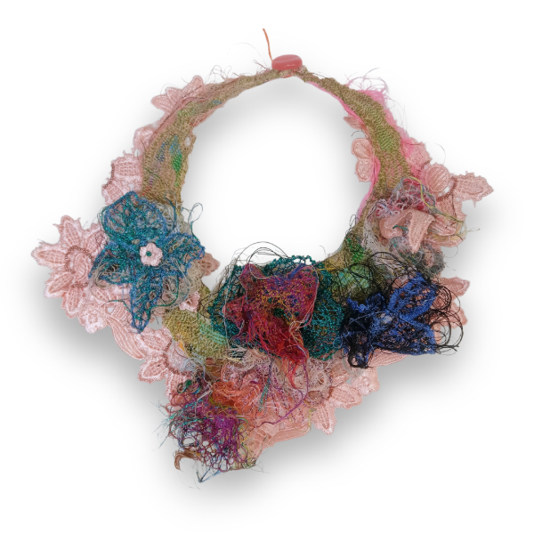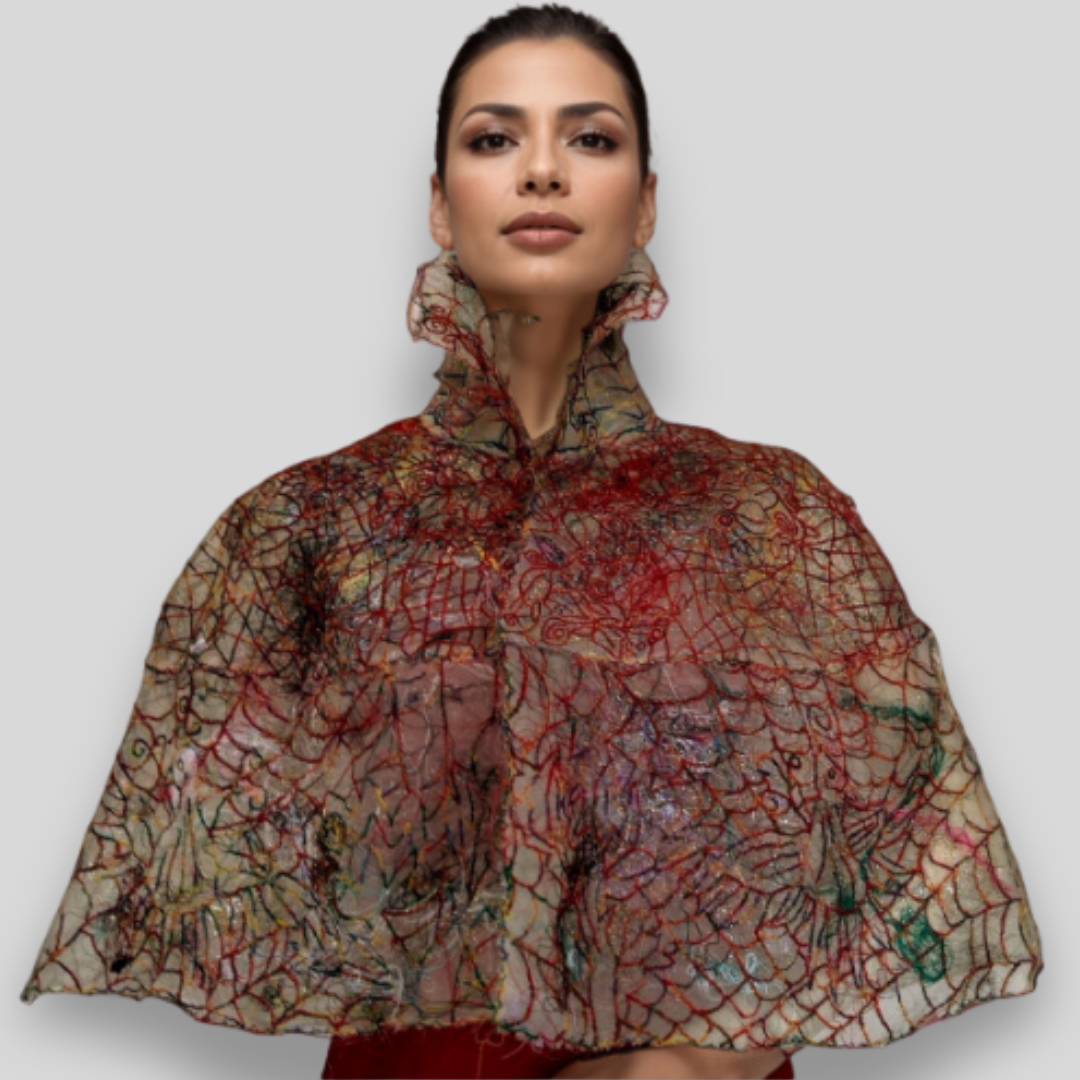 Free motion embroidery capelet repurposing thread scraps and curtain sheer.