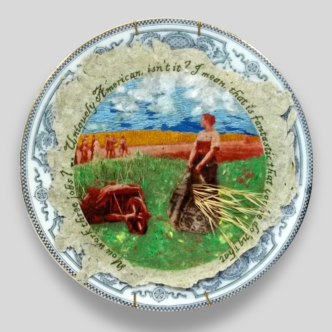 Embroidery, handmade paper, image transfer, straw, floss, china plate, 12" x 12" x 3"