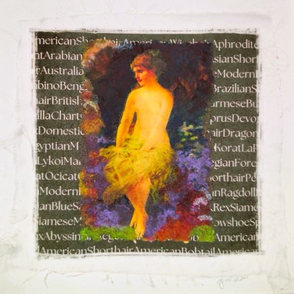 Image transfer on silk, colored pencil, Arches paper , addition of AI movie manipulation 6" x 6"