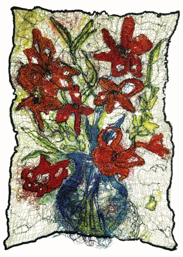 Free motion embroidery, hand embroidery, image transfer on cotton, iridescent threads 18" x 18" x 4"