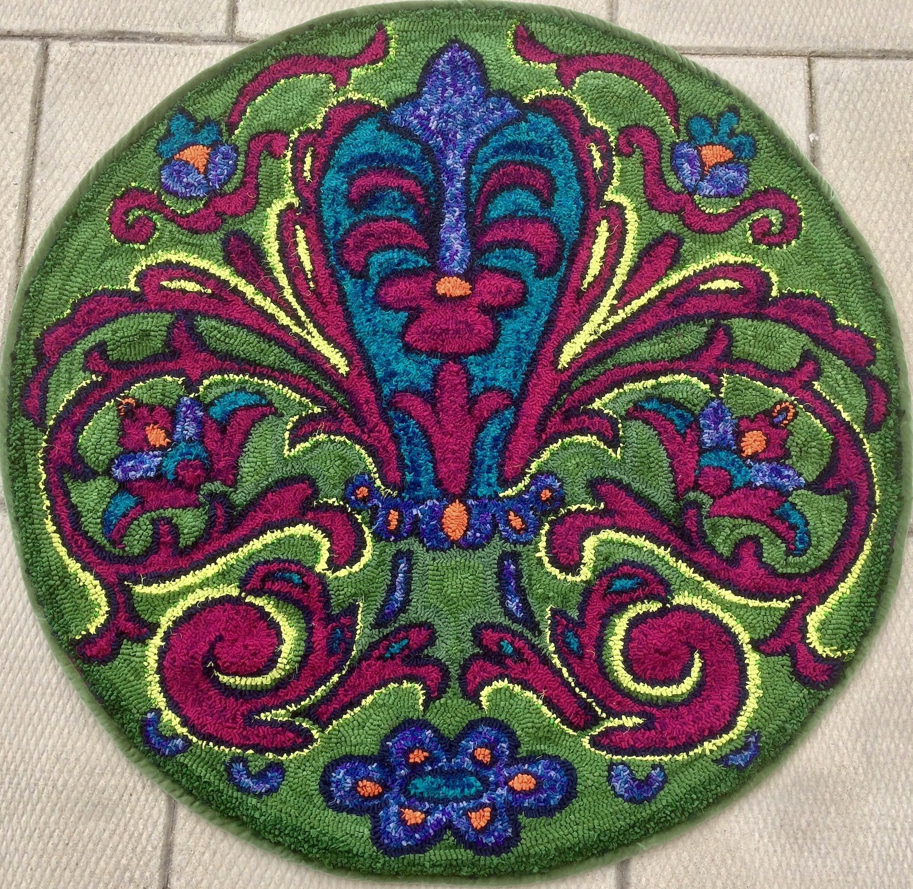 Traditional rug hand punching using slim hand cut strips of fabric, not tufted using a machine. The fabric used in this rug is recycled, and I made every attempt to use only recycled wool. The backing is burlap. 47.25 inches by 80 inches by .5 inch