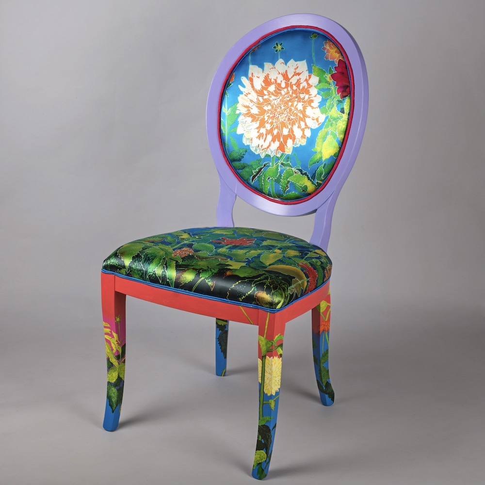 Hand painted found wooden chair frame, embroidery, painting & embellishments, LED lights, sound, motion sensor 105 cm high, 52 cm wide, 50 cm deep