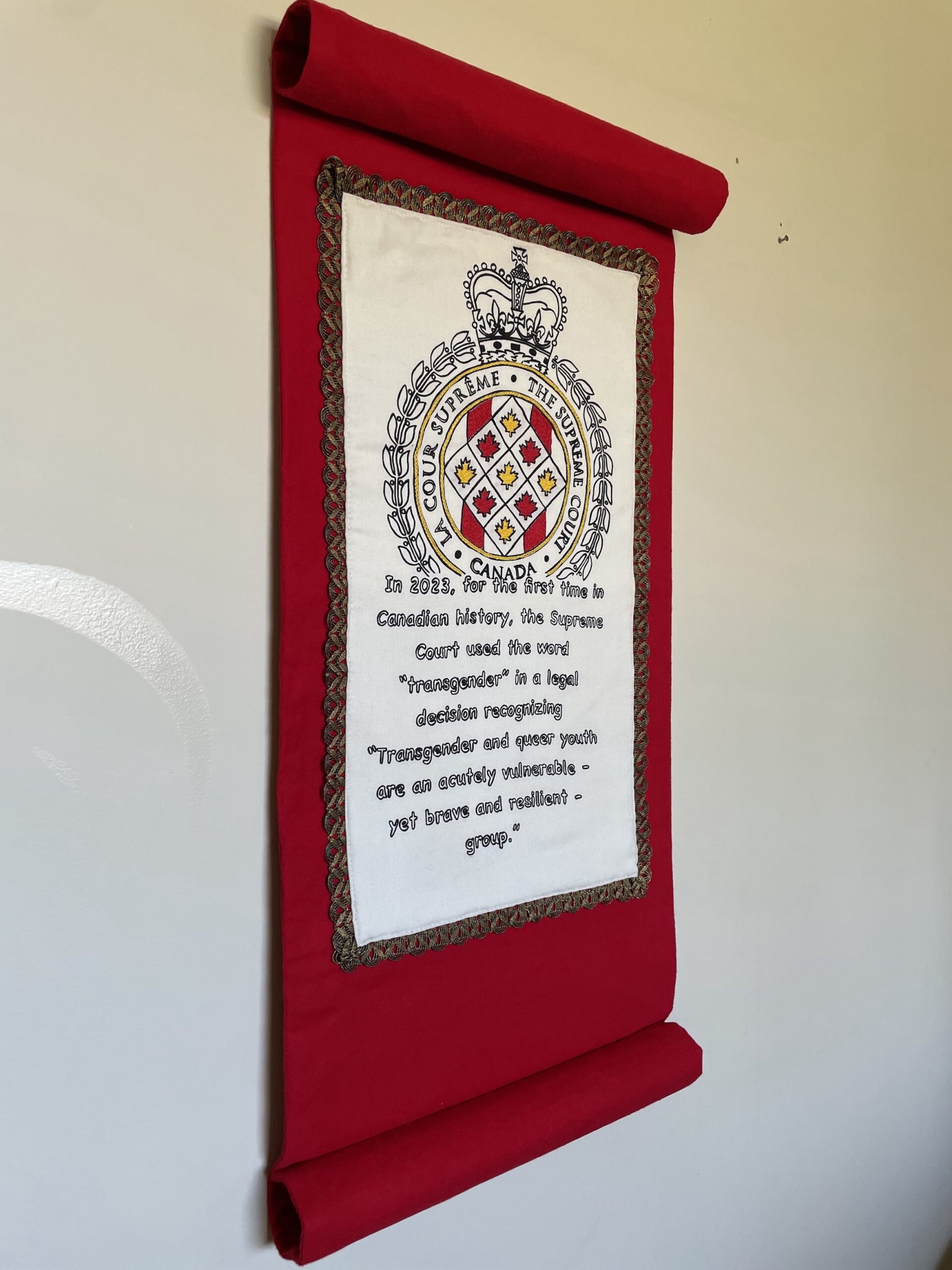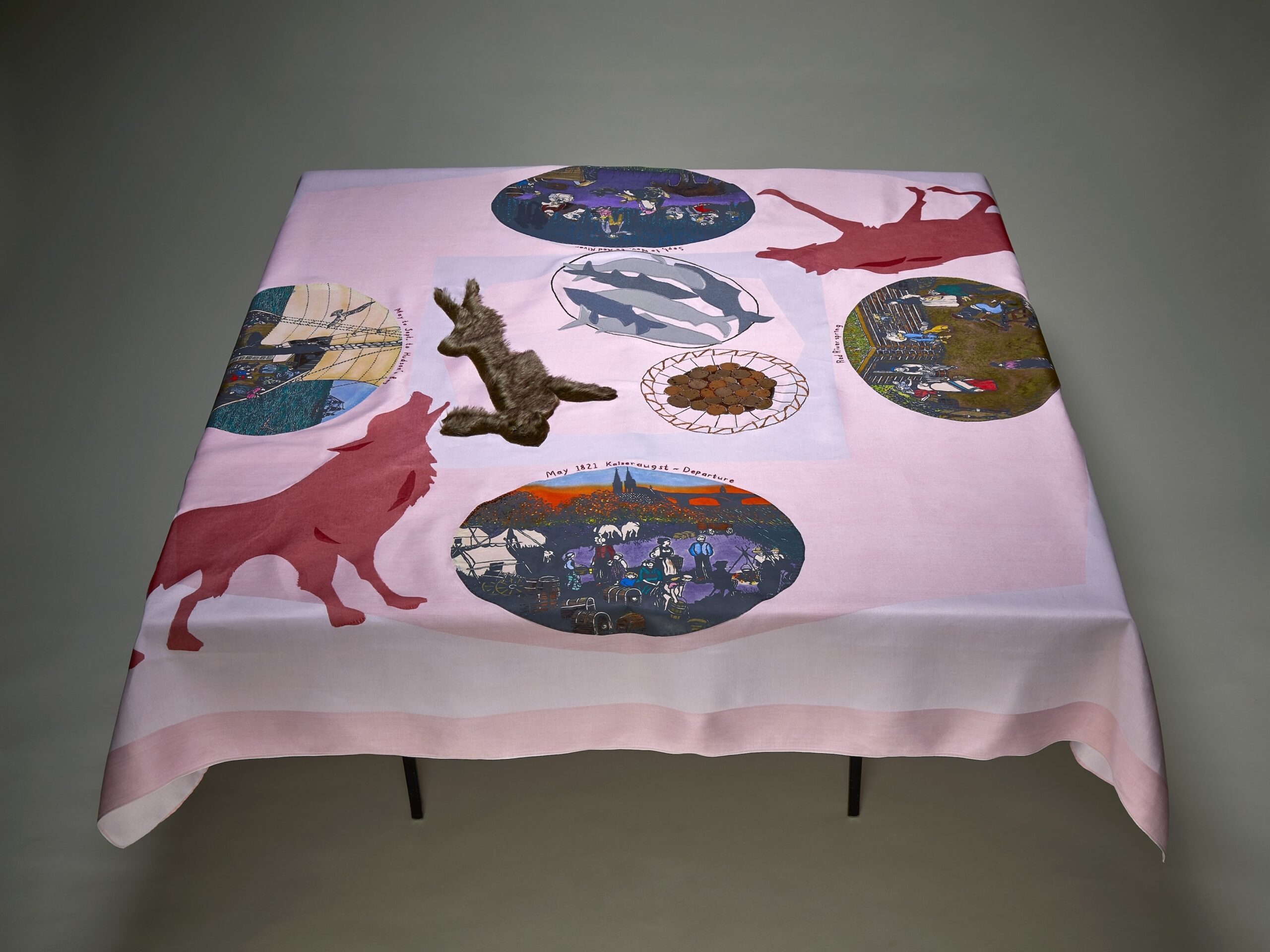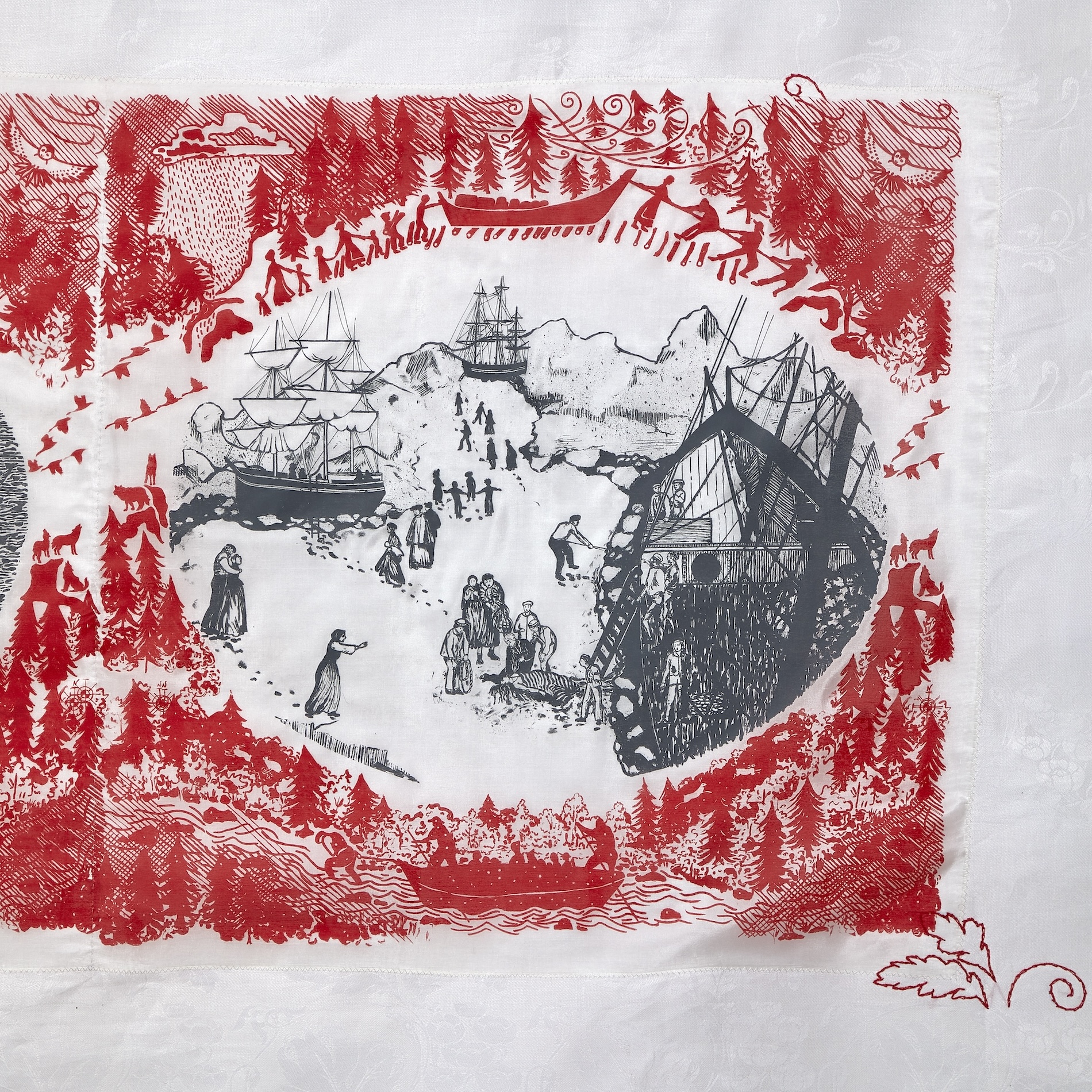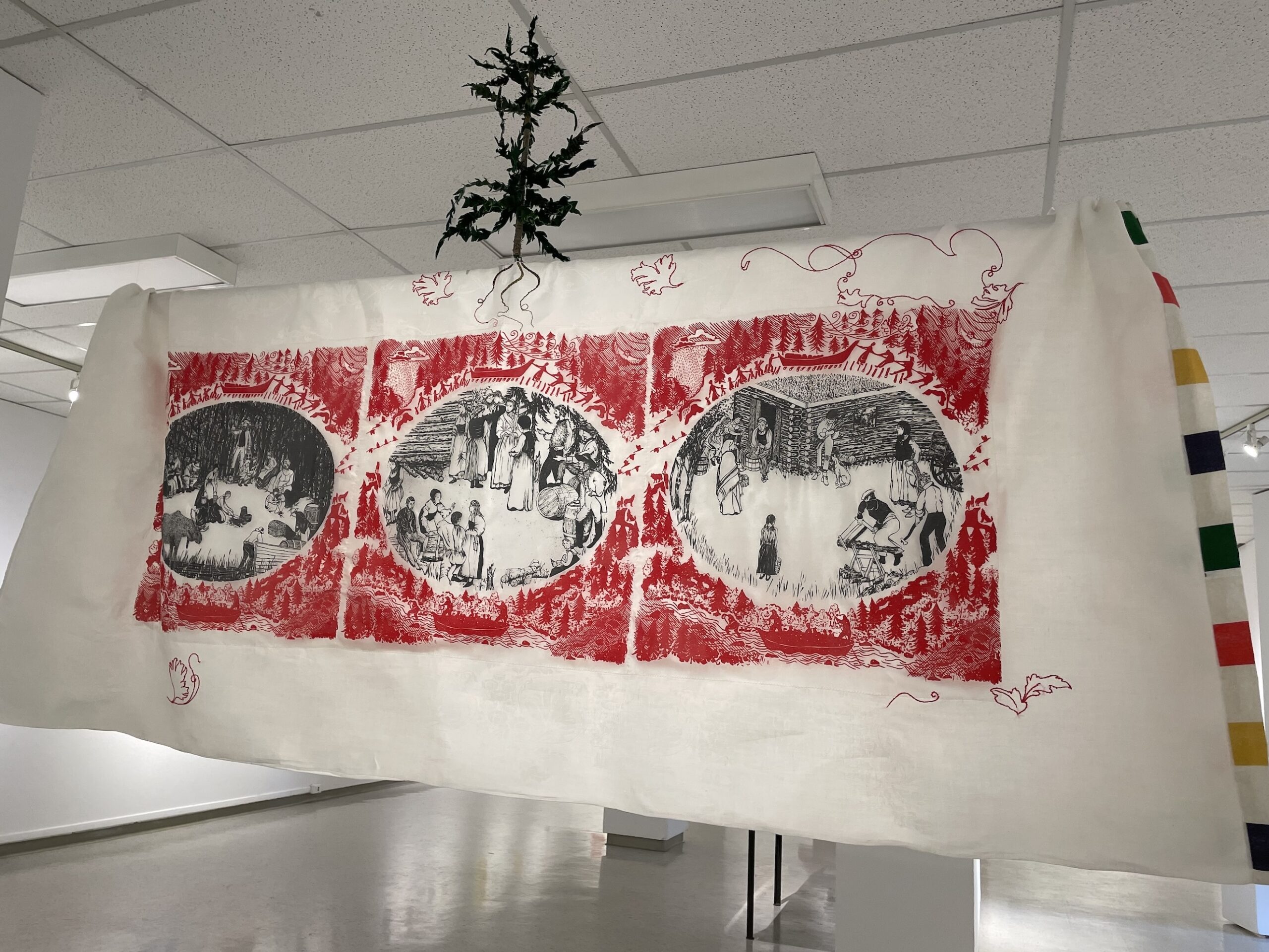 Screen printed silk on damask tablecloth with embroidery, tree handcrafted from textiles, Hudson's Bay colours sewn on 1 side. Tablecloth is hung so viewers can walk around it. 84" long x 34" high; with tree: 84" long x 50" high