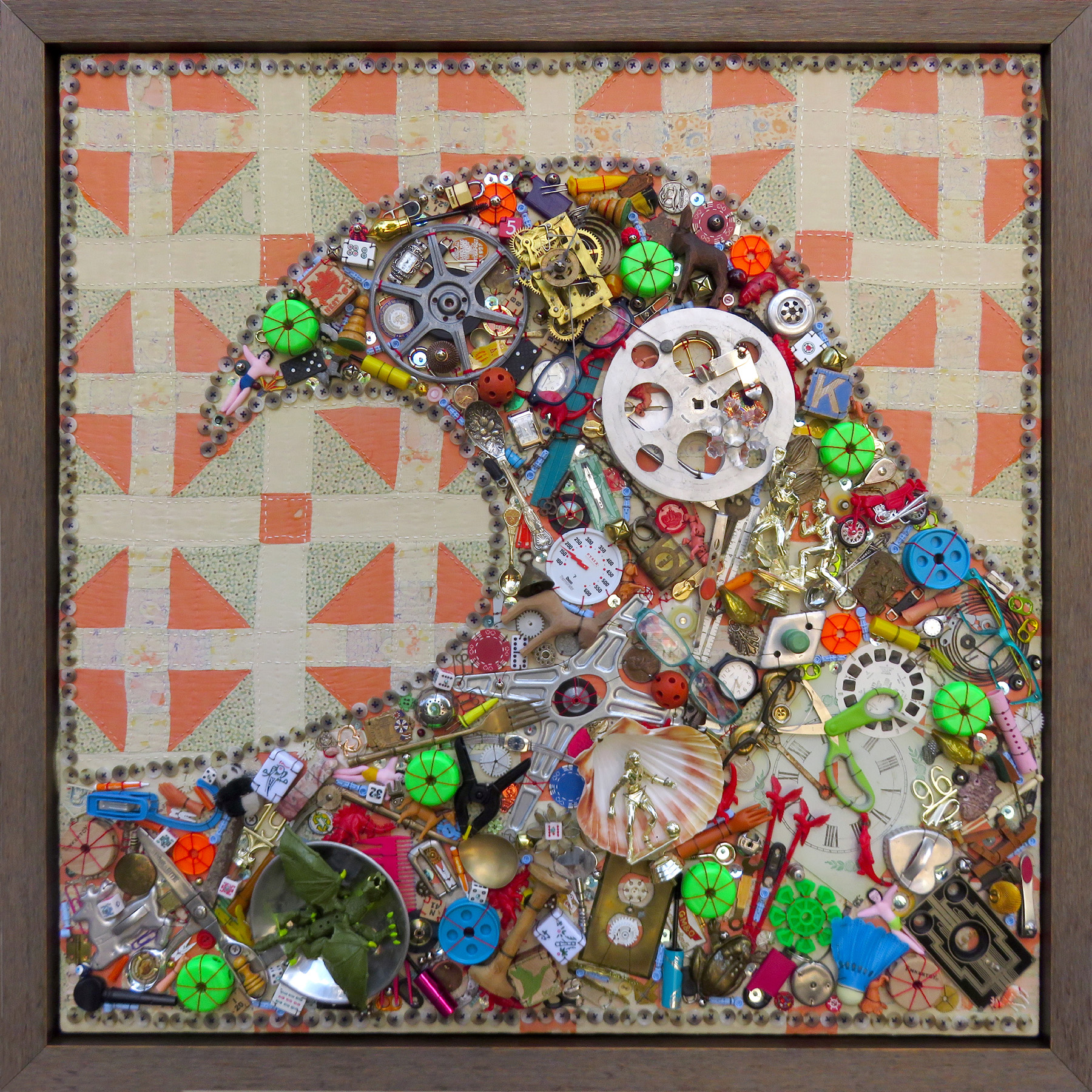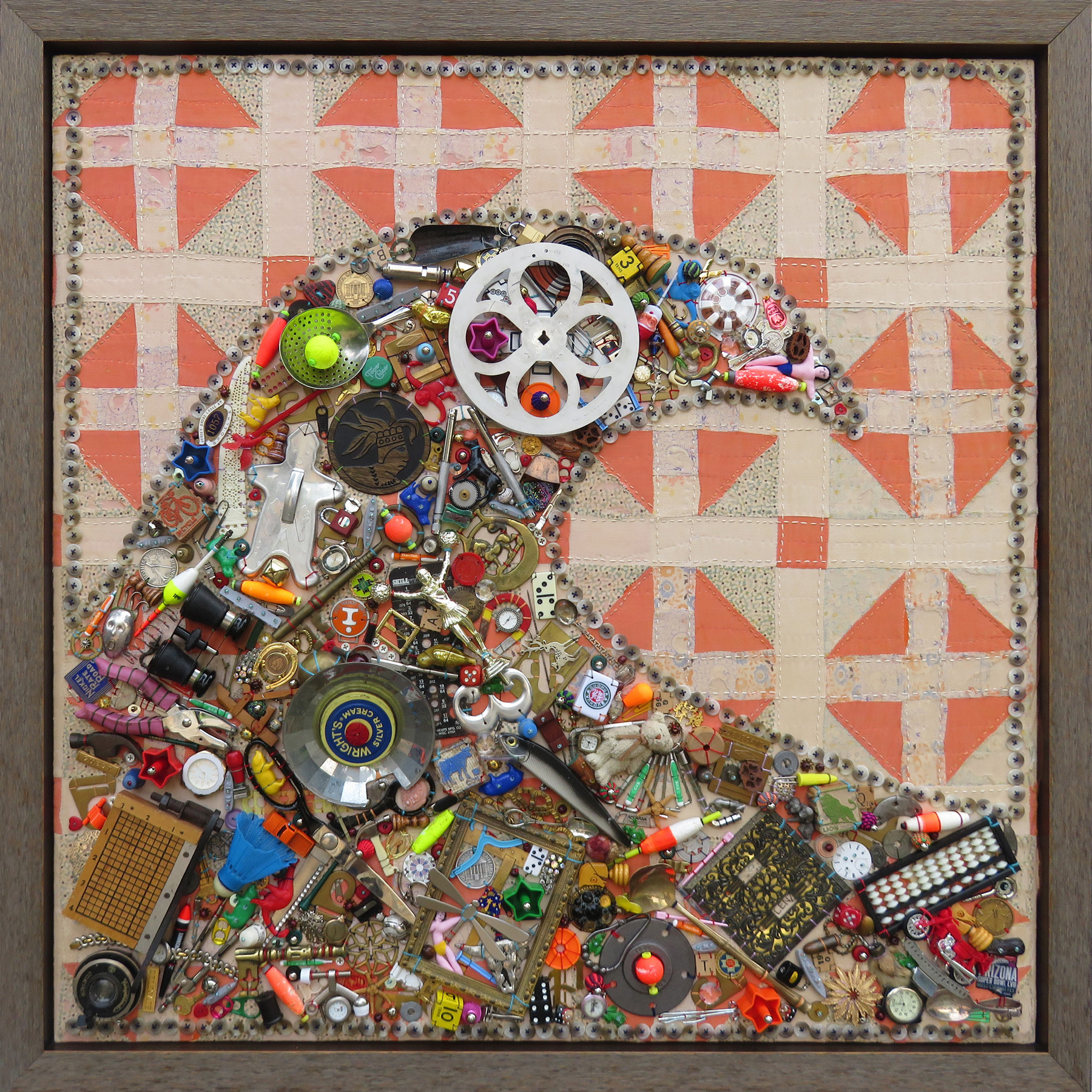 Found objects hand-stitched to a section of a vintage quilt 35" x 35"