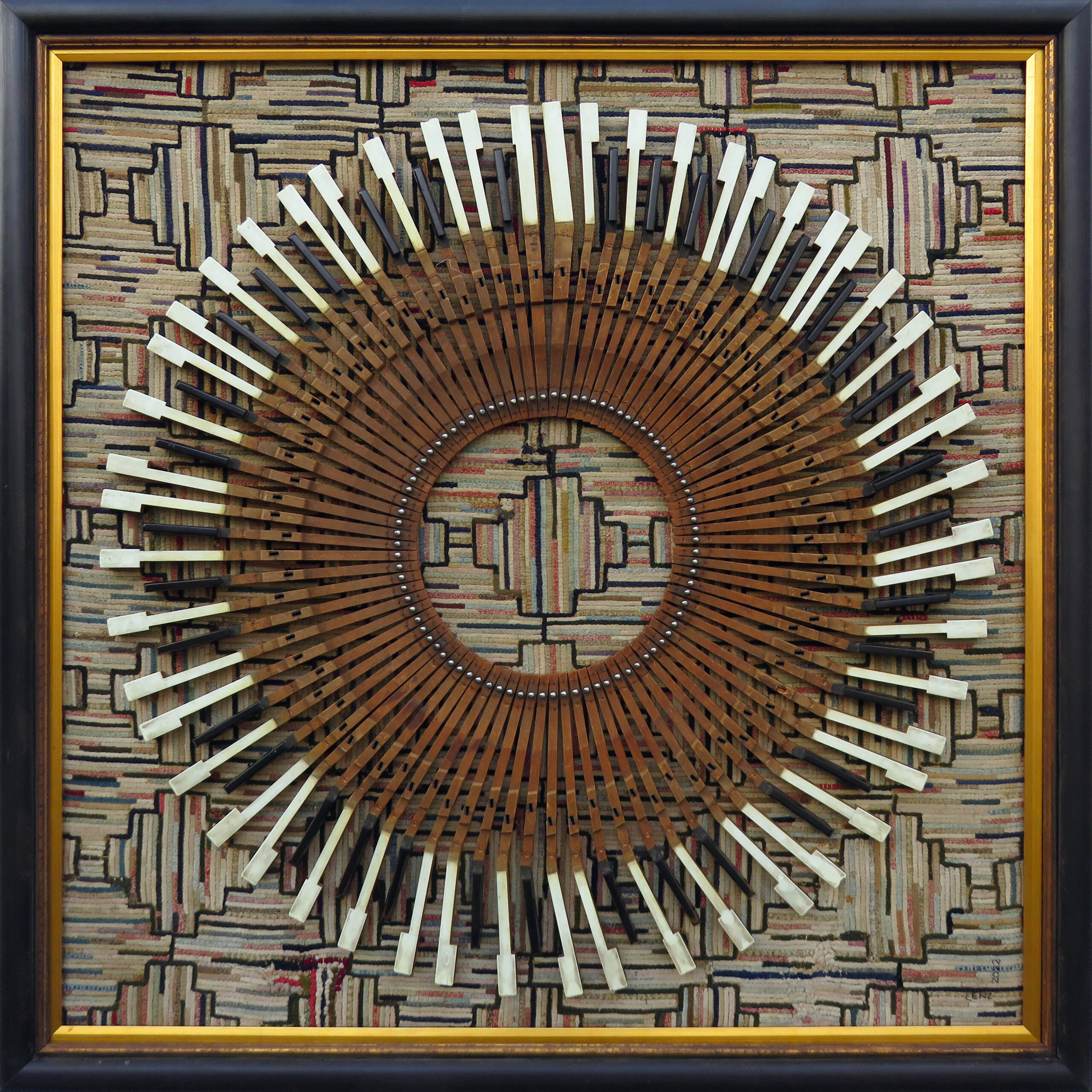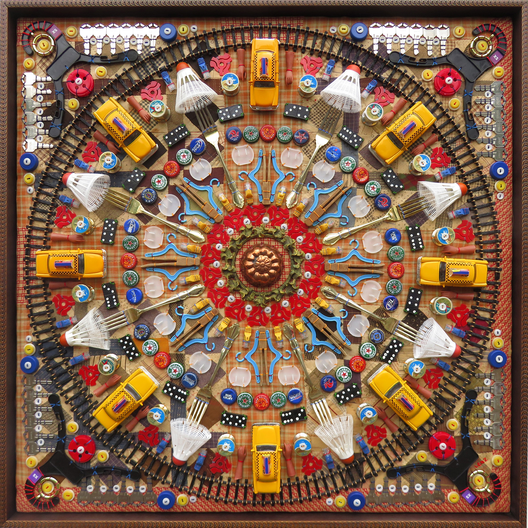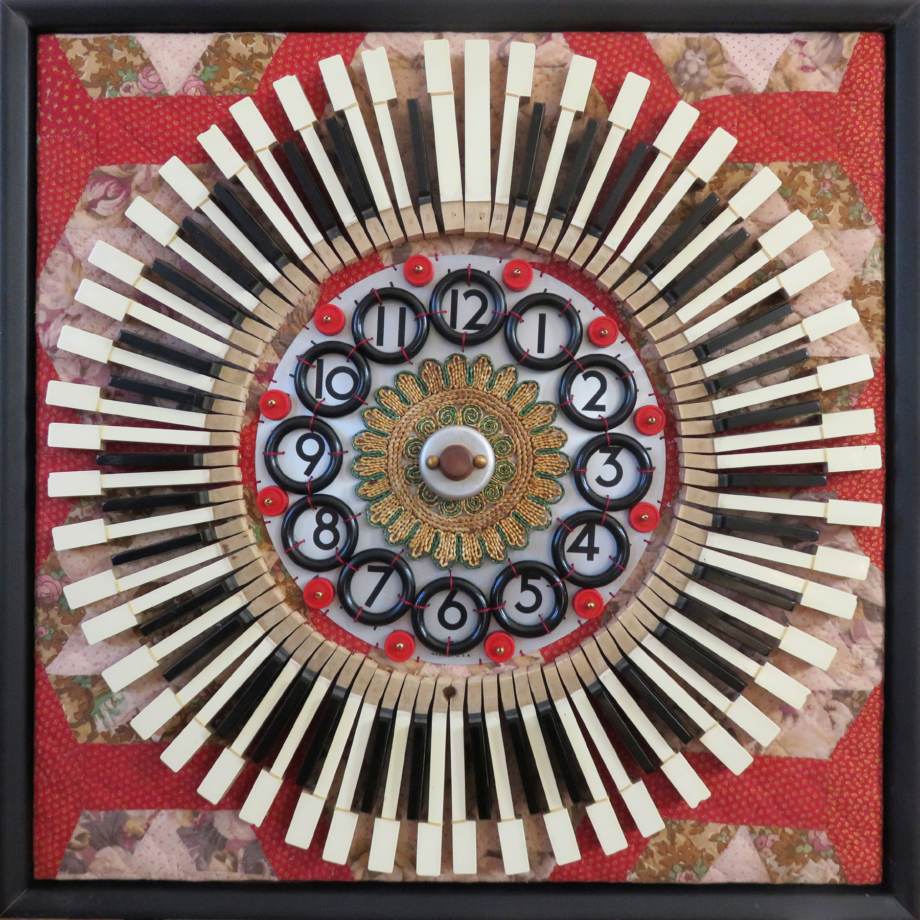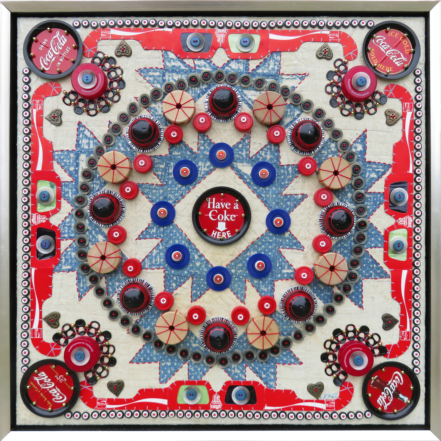 Using multiples of seemingly mundane objects puts into perspective the abundance of life and the capacity to keep things as if for a "rainy day". Paper clips, keys, bottle caps, buttons, nails, plastic spoons, and old clock parts are found in most homes. These and so many other, often vintage items are repetitively hand stitched into meditative patterns on sections of old quilts, bringing an extraordinary new life to otherwise everyday things.