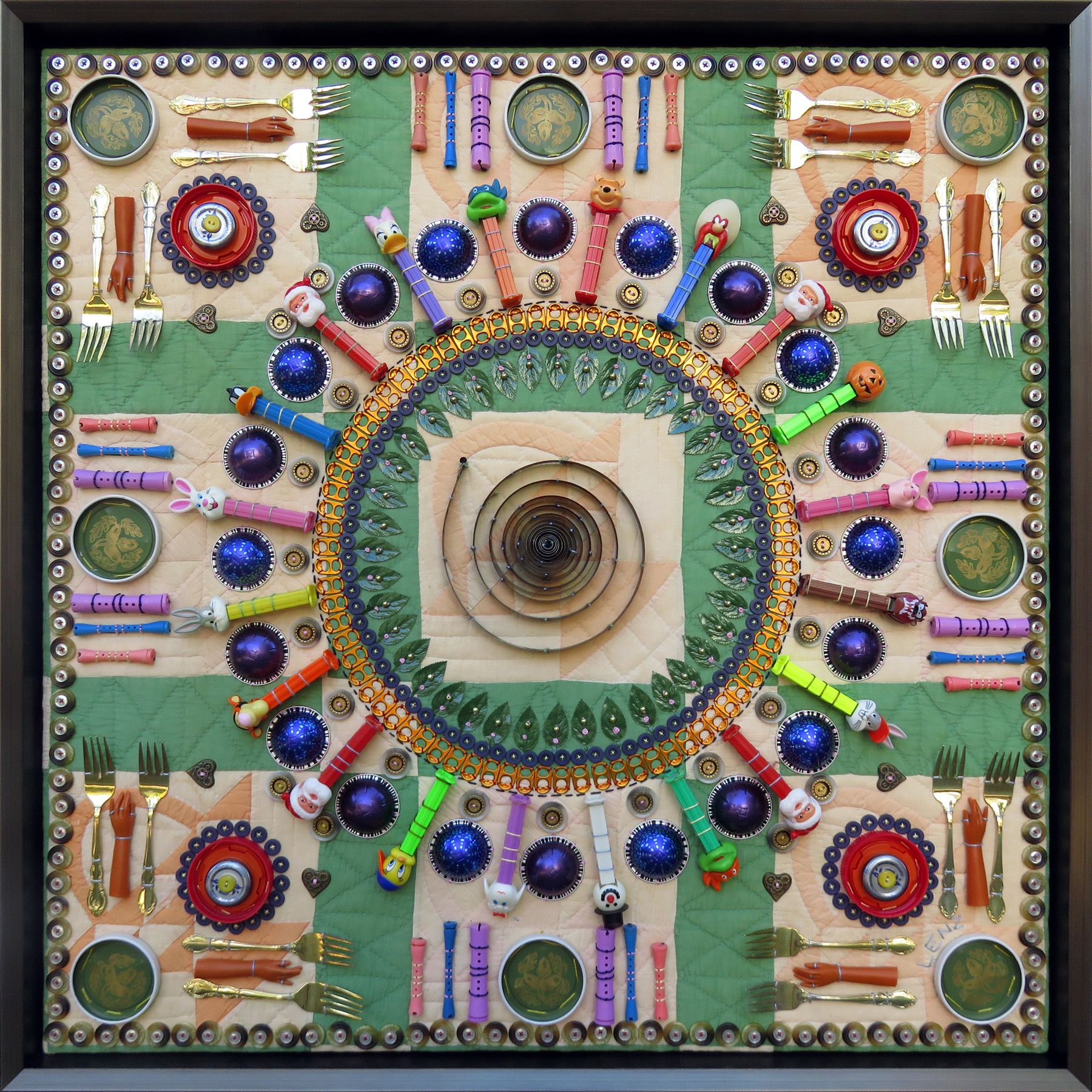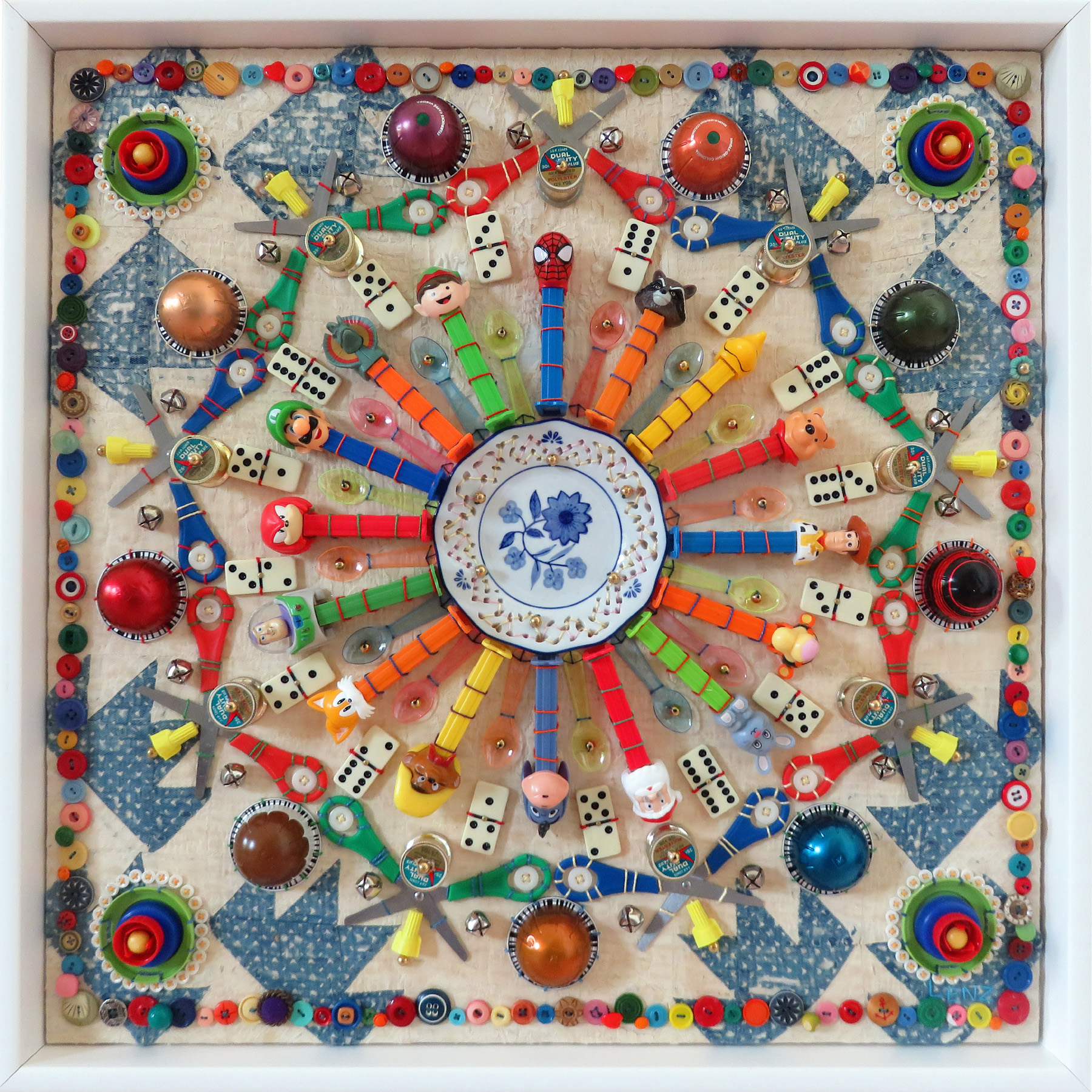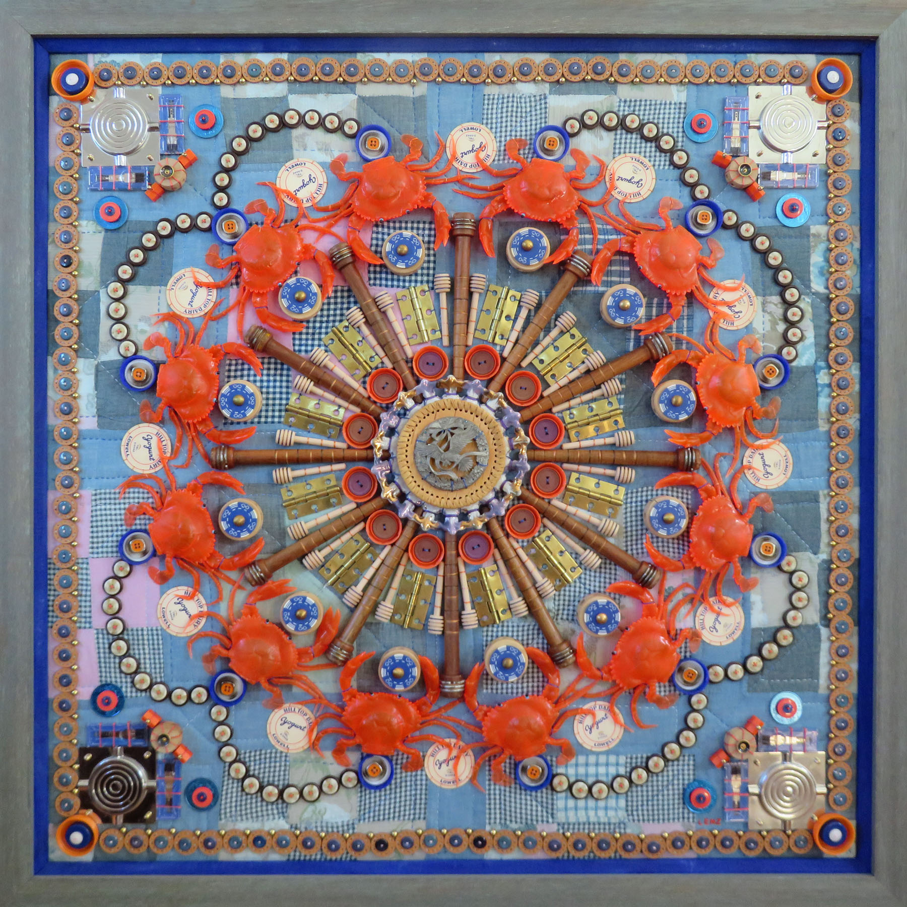 I started stitching my found object mandalas during the pandemic. It was my attempt to deal with a changing world and a way to adapt to virtual opportunities that replaced in-person exhibitions and events. For me, using multiples of seemingly mundane objects puts into perspective the abundance of life and the capacity to keep things as if for a "rainy day". Concentric circular arrangements tapped into the ancient, meditative practice of making a mandala and provided a strong, graphic design that appealed in the new, virtual world. Using old, often obsolete things and plastic objects kept them from a landfill fate. This appealed to my environmental concerns. Paper clips, keys, bottle caps, cookie cutters, checkers, plastic spoons, and old clock parts suggested home, family, and a common nostalgic past. Repetitively stitching these every day items onto sections of old quilts brought an extraordinary new life to otherwise ordinary things.
