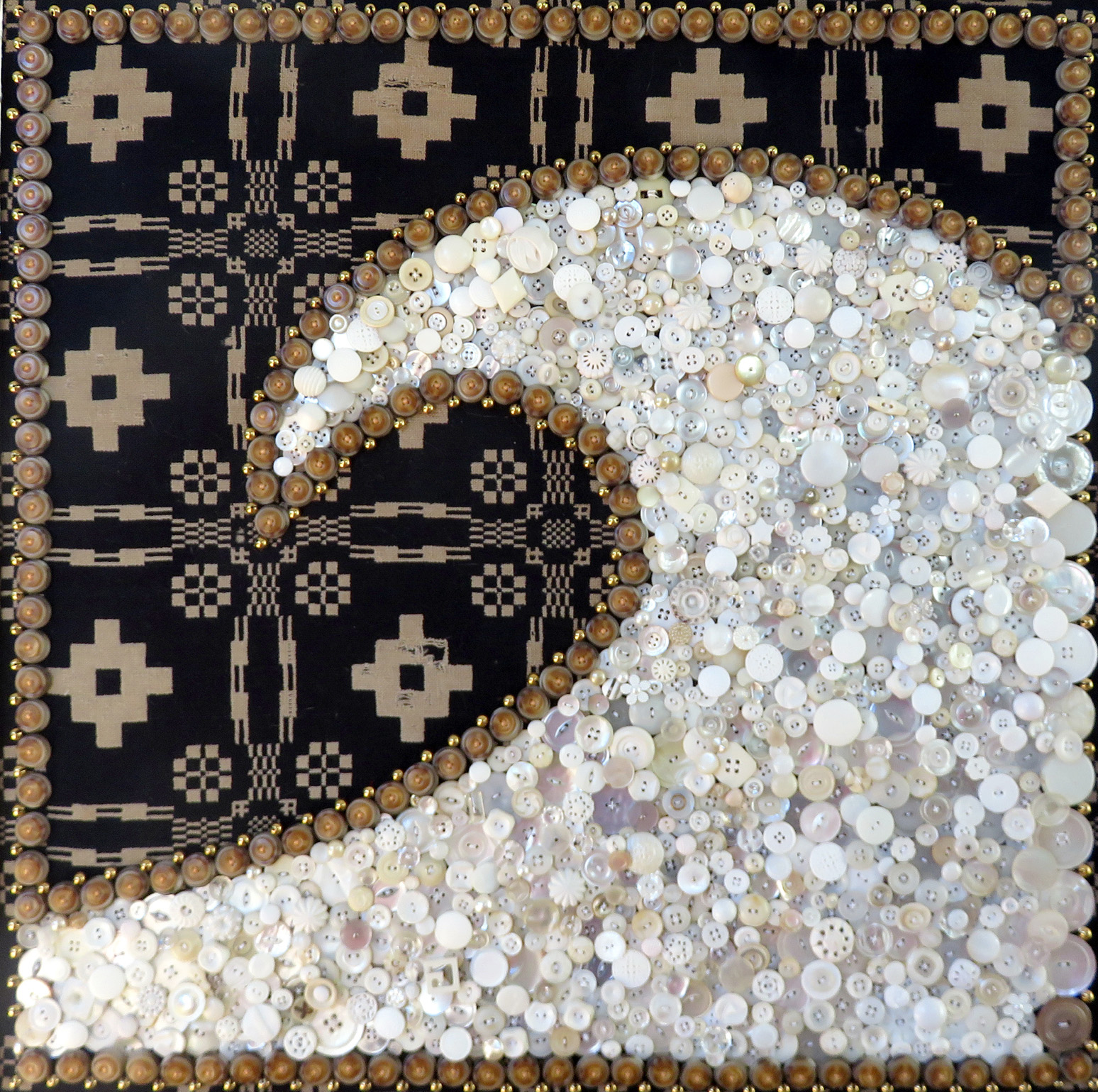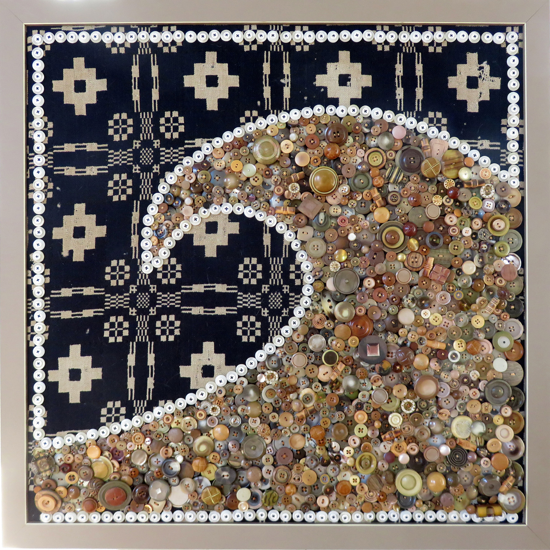 Buttons, beads, thread, section of an antique coverlet 30" x 30"