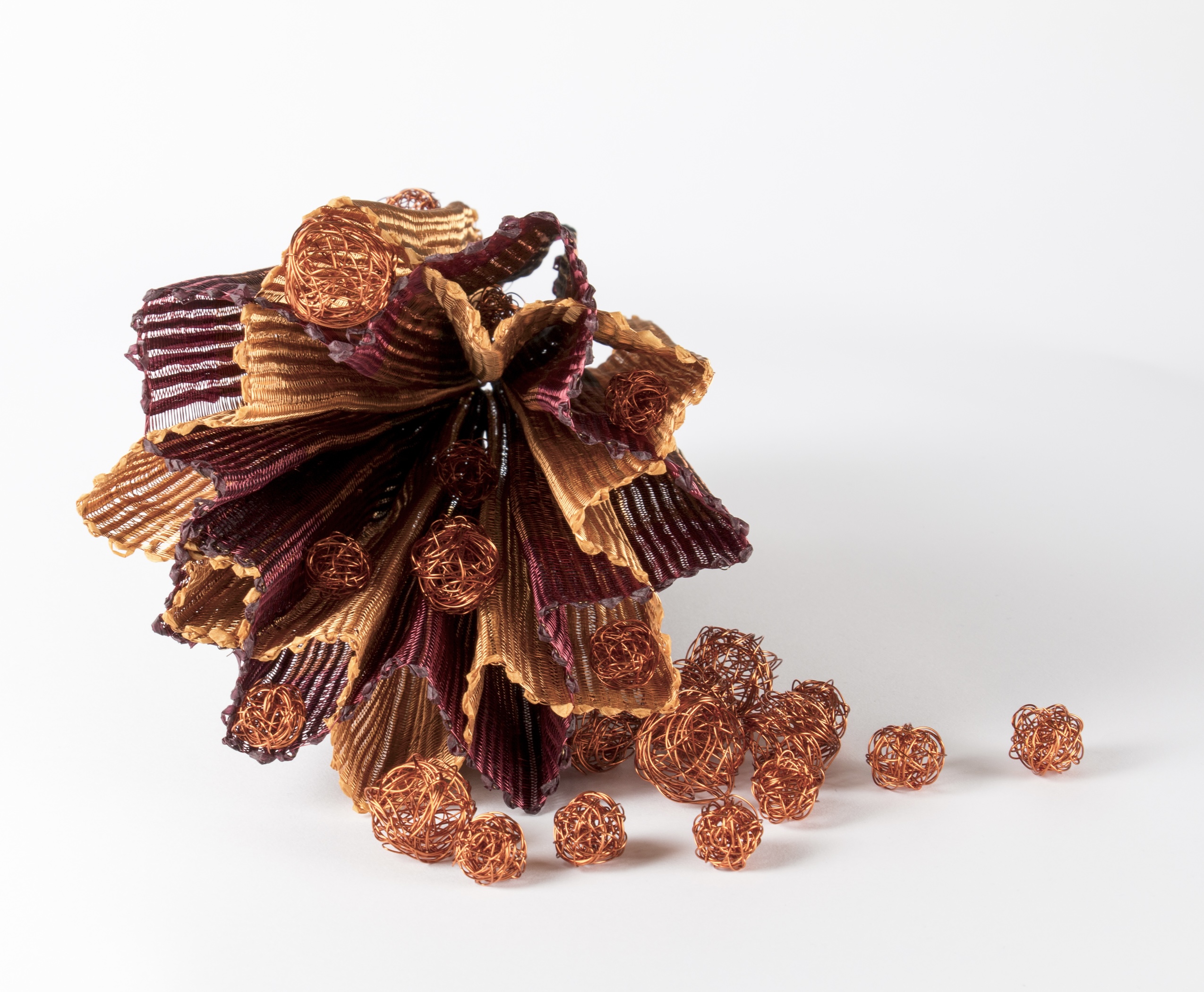 Cinched is a loosely arranged woven metal fabric that is softly pleated and held together with antique copper beads. The form can be wound into a tight spiral or can be opened up into a more loose form, reflecting how our energy can feel at various times.
