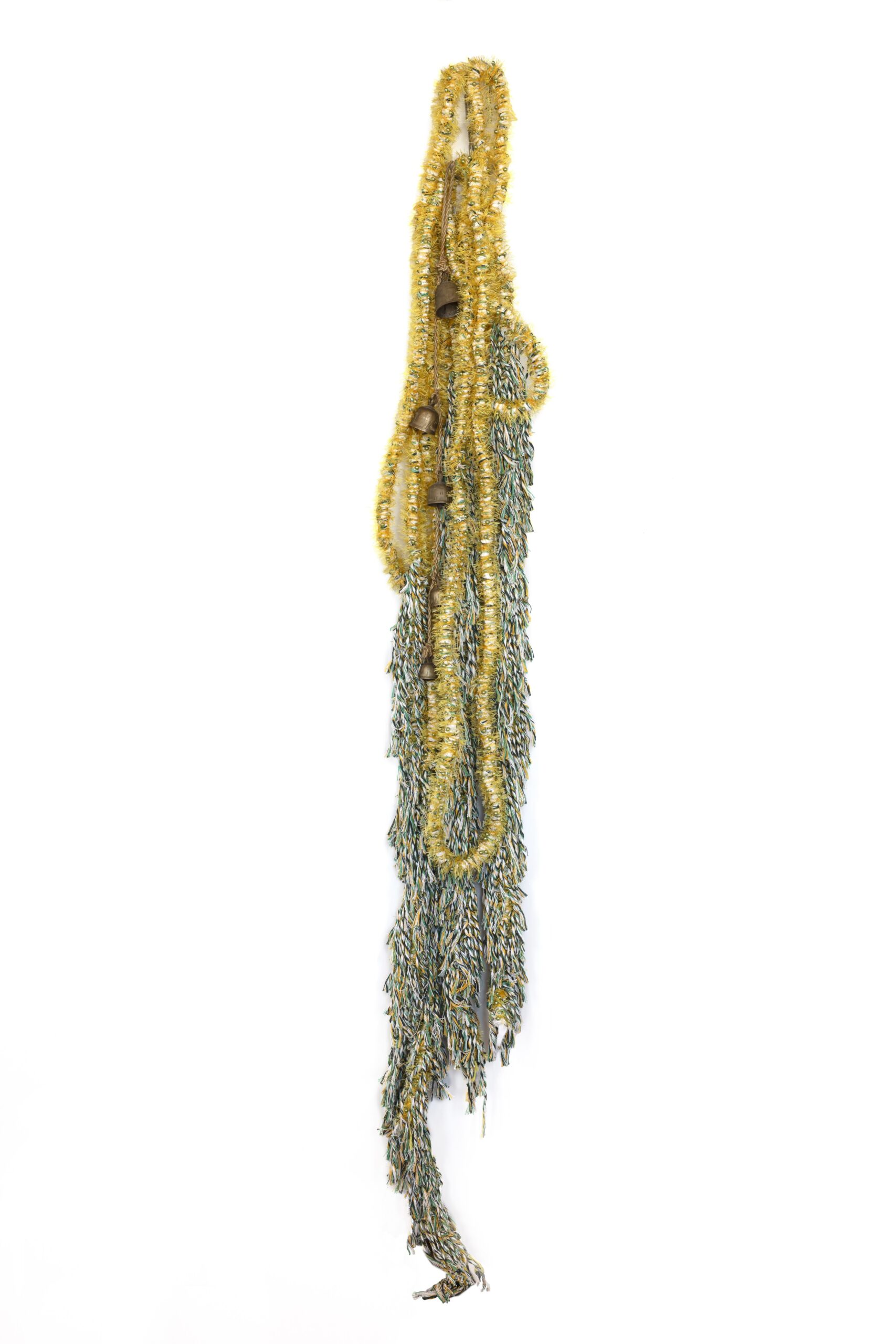 Beaded Yellow Gal transforms a childhood label into a vibrant narrative of self-definition. This work is made from upcycled linens, knotted into braided rope, intertwined with cotton string, eyelash yarn, cascading fringe, and adorned with a string of antique bells. Each element serves as both a reflection of personal history and a declaration of reclamation. As a child, being called "yellow gal" was an imposed identity. This work channels those experiences into a masquerade costume of vivid color, movement, and sound. The antique bells echo the complex duality of celebration and weight, signaling liberation while reminding us of the chains of societal labels. The knots and textures speak to the intricate weave of identity, shaped by memory, context, and culture. In transforming this identity into a carnival costume, I claim agency over a narrative once imposed on me. This piece becomes a symbol of transformation—a vibrant expression of joy and defiance that can be worn but, crucially, also taken off. It reminds us that the labels others place on us do not define who we are but can become threads in the larger tapestry of our self-created story.
