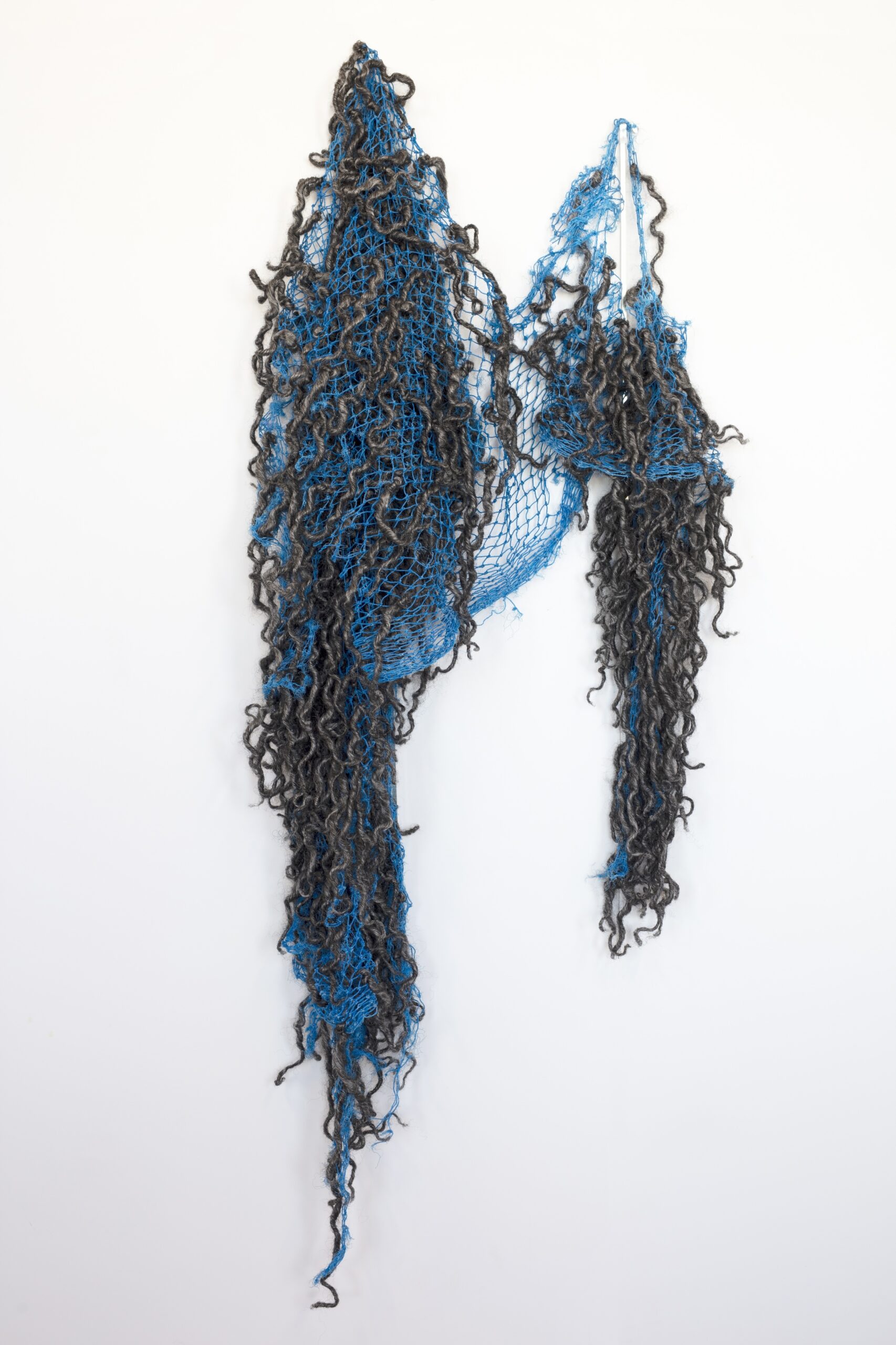 This artwork explores the unseen threads connecting past, present, and future, woven with memory, magic, and spiritual protection. Using a blue commercial fishing net that washed ashore after a hurricane and crocheted with gray locs, this sacred net bridges the realms of the living and the dead. The net carries ancestral memories, connecting us to voices lost to the Atlantic slave trade and honoring the water graves of those who perished. This object, a conduit, stretches beyond the physical world and transforms into renewal and release, reminding us that the souls of the departed endure in every knot and thread, shaping our collective consciousness.