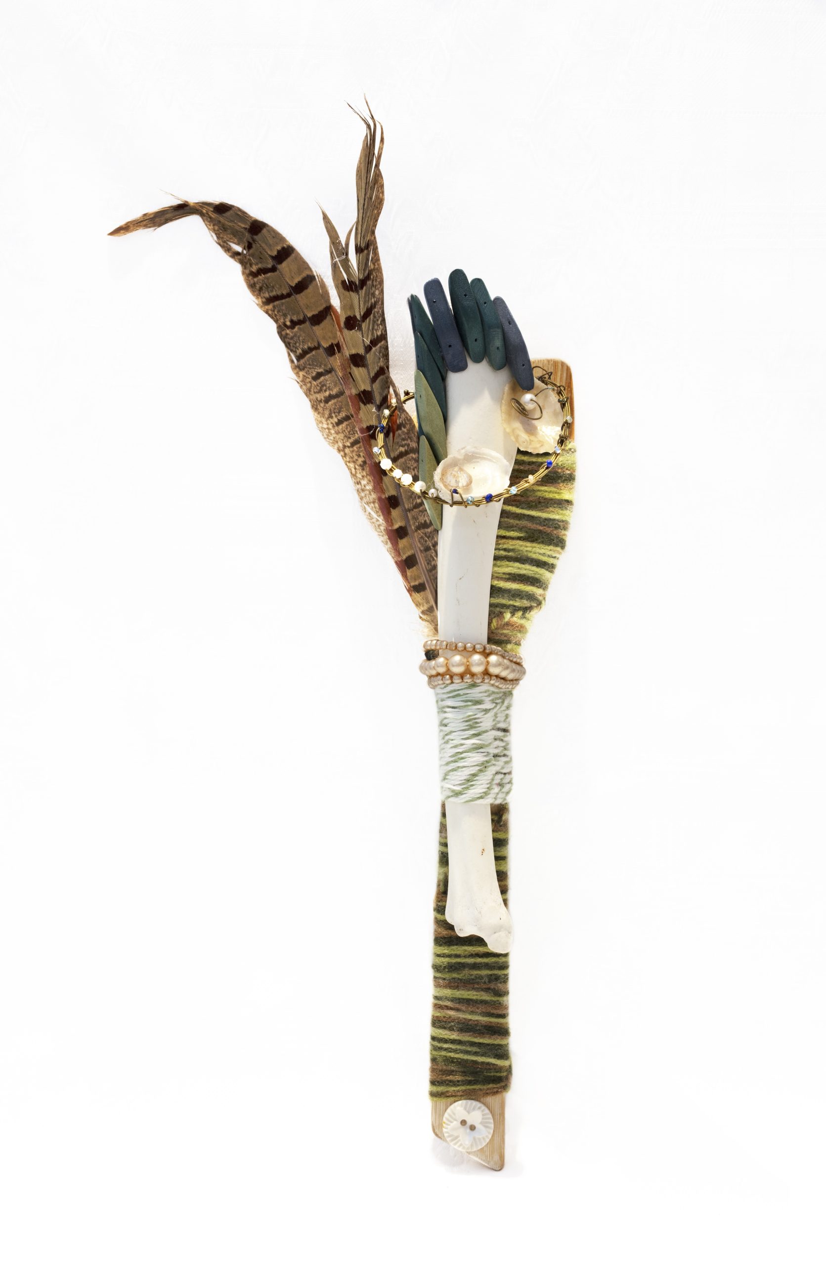 Moonlight, discarded wooden spatula, yarn, pheasant feathers, bone, selenite, coral, cowrie shells, beads, rhinestones, buttons, wire and crosses. 16 x 4 x 2 "