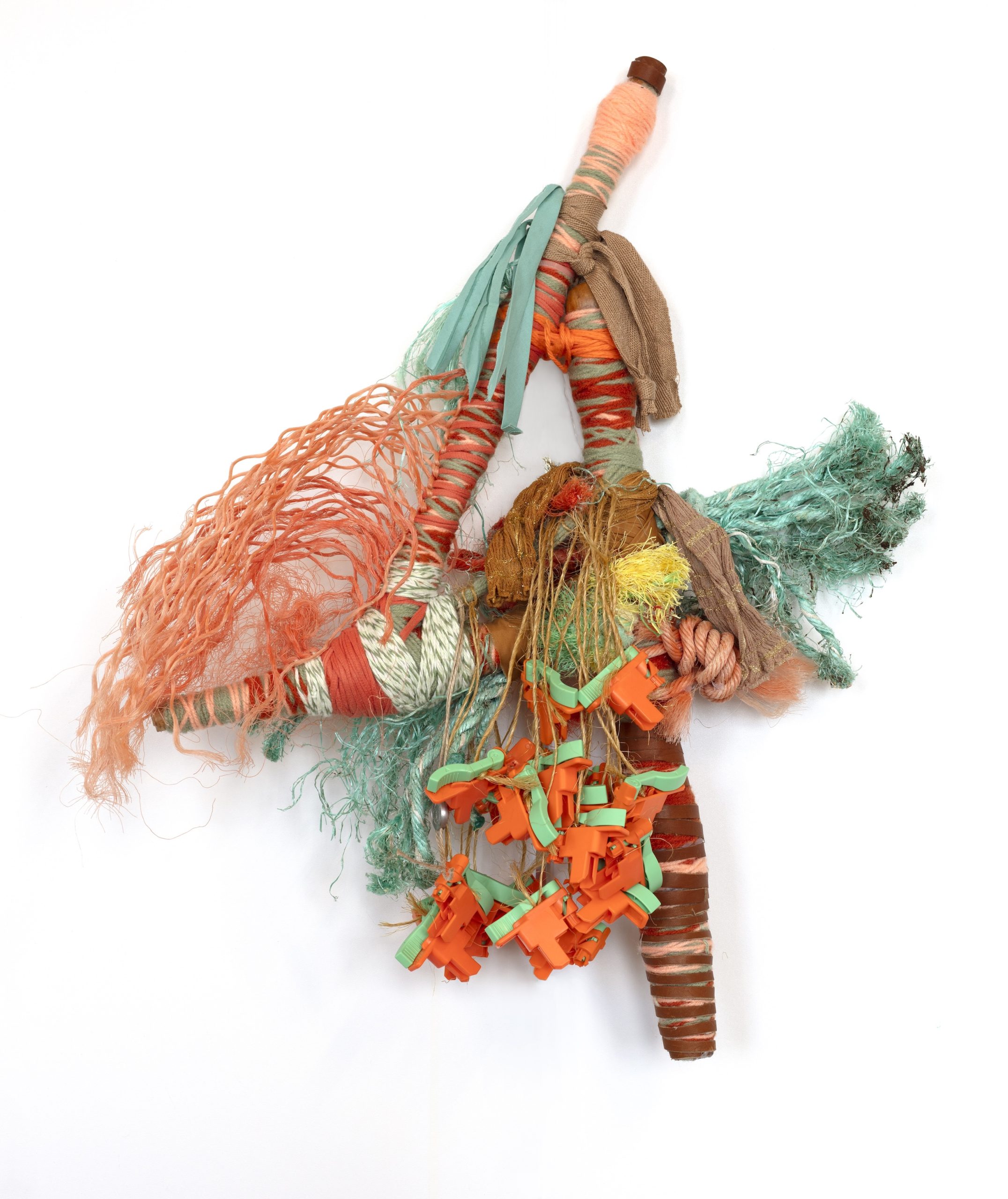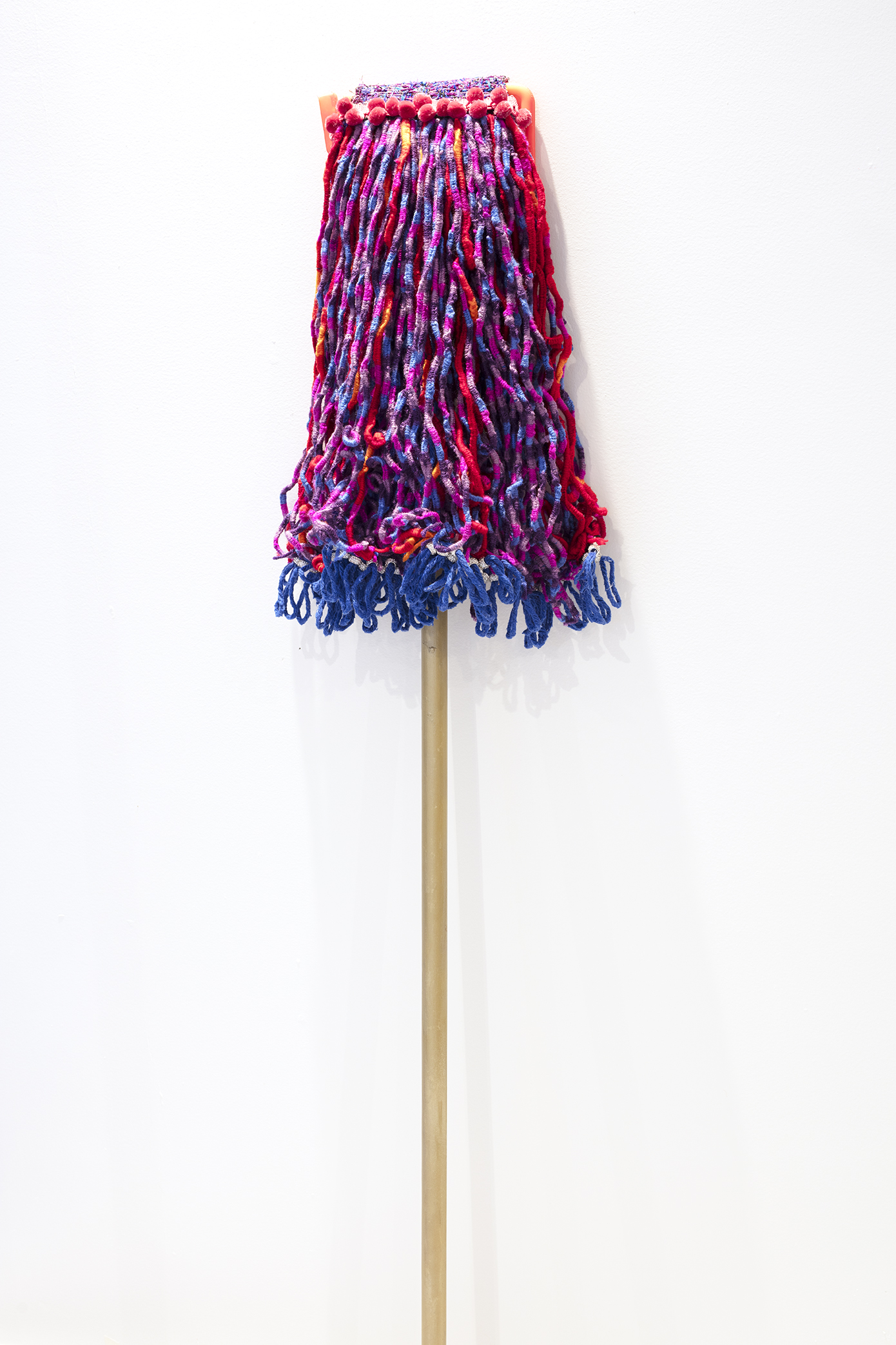 Upcycled mop, acrylic yarn, rhinestone beads, embroidery thread and gold leaf. 60 x 12 x 5 in