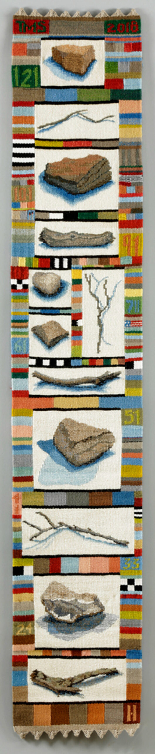 In 2018 I devoted the year of the tapestry diary to the phrase "Sticks and Stones...." because of the political and social upheaval in the United States. This was my way of making a positive thing from negative emotions I felt from the state of the world. This is one of my ongoing year-long tapestry diaries with each color change being woven on a different day of the year. The stick and stone images were woven within each ongoing month, beginning at the bottom with January, 2018 and building up to the top to end on December 31, 2018.