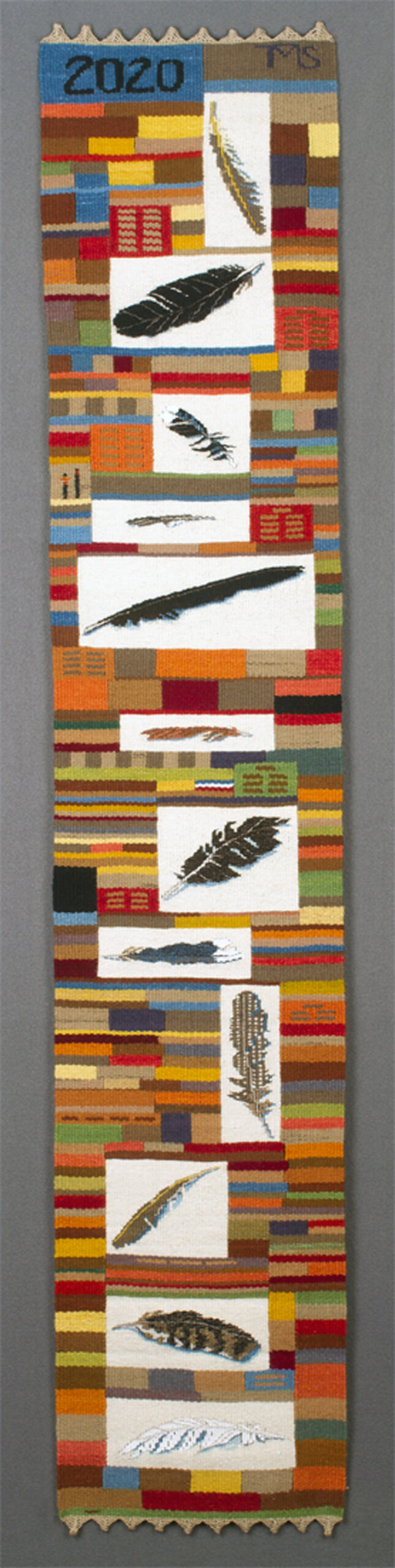 This is one of my ongoing year-long tapestry diaries. In 2020 I felt that hope was what I needed to face each day of uncertainty. My tapestry diaries are ones in which I weave a small part each day of the year--every color change in the tapestry was done on a different day. Every month I selected a feather to weave within the framework of the changing days. A portion of Emily Dickinson's poem, "Hope," was my inspiration: "'Hope' is the thing with feathers-that perches in the soul-and sings the tune without the words-and never stops-at all."