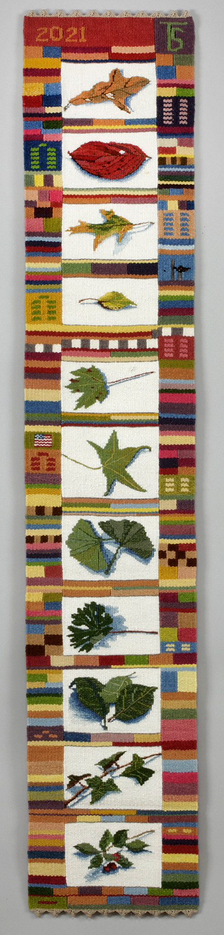 This is one of my tapestry diaries. Each leaf was found during the month in which I wove it, beginning at the bottom with January and moving up.