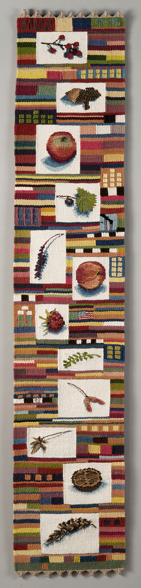 This is one of my tapestry diaries. Each seed, nut or fruit was found during the month in which I wove it, beginning at the bottom with January and moving up.