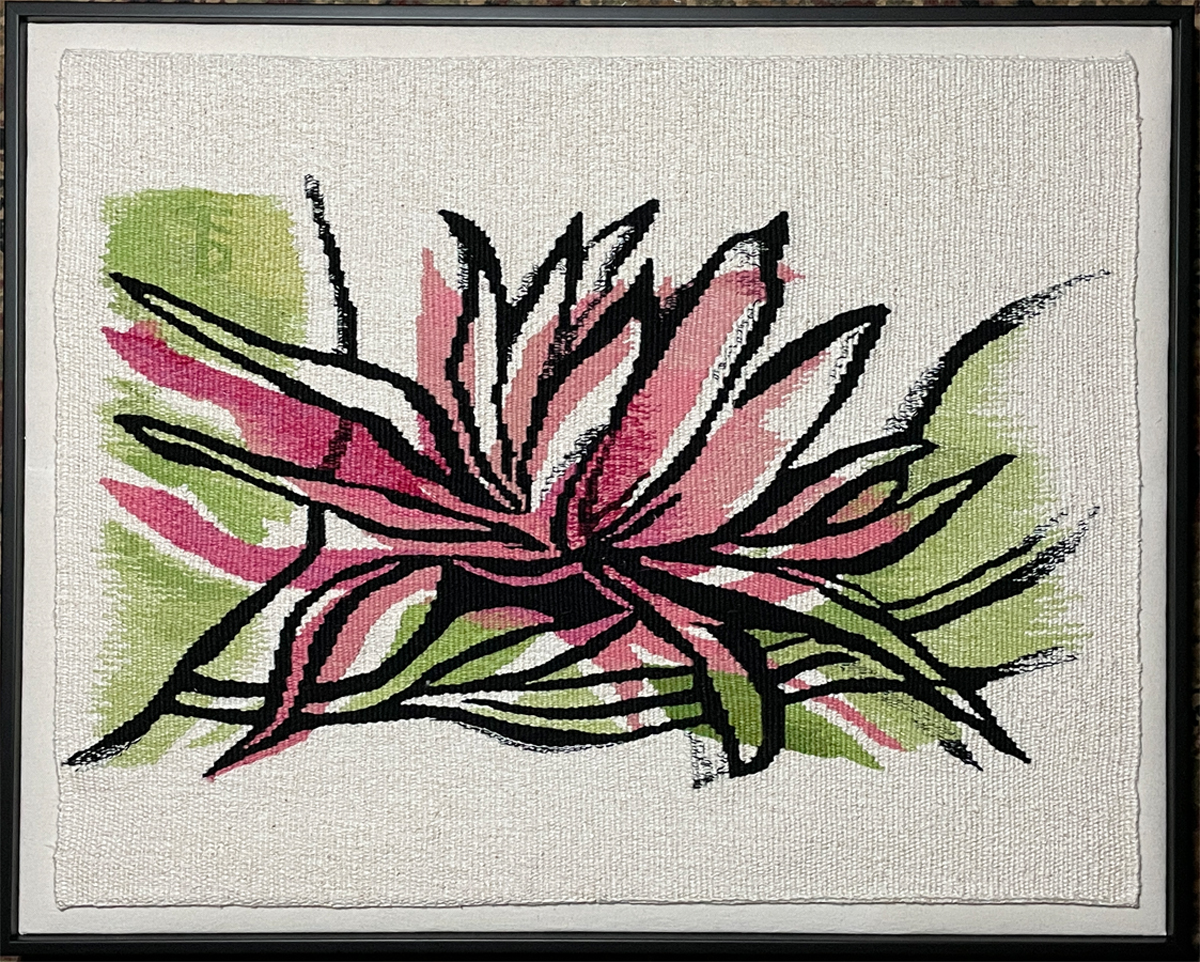 Memories of Ferns was done at the end of 2020, the first tapestry of larger size that I was able to complete during the first year of the pandemic. I wanted to evoke a sense of loss by making the fern frond transparent. I've used dark/light rectangles in other works to signify departure. By combining these two ideas I expressed a little of my feelings of helplessness about the state of the world's health.