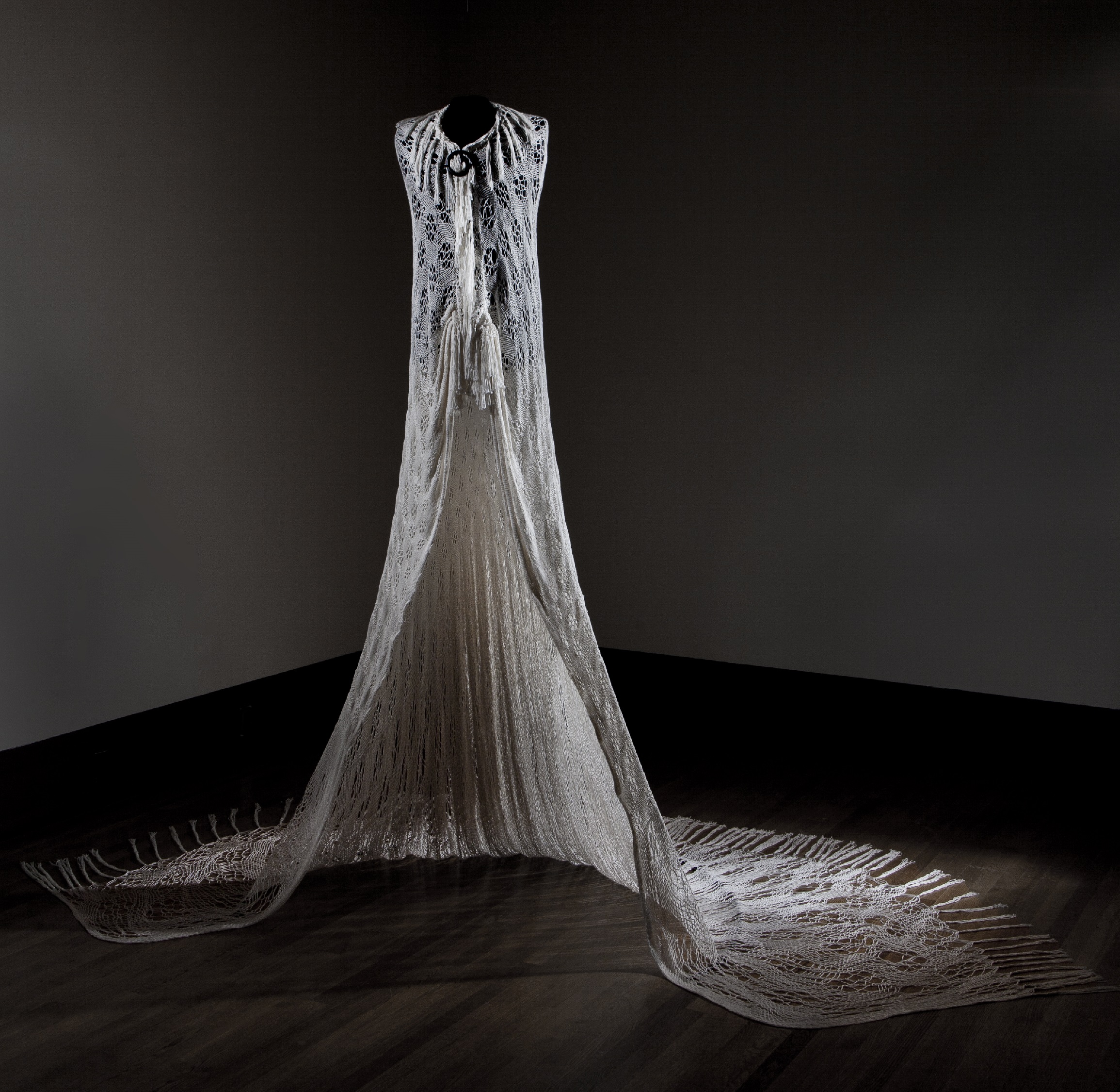 Porcupine quills, warbla therma plastic, leather, satin, cotton, grommets, sewing thread, hook and eye, invisible zipper, fusible interfacing. 54"x45"