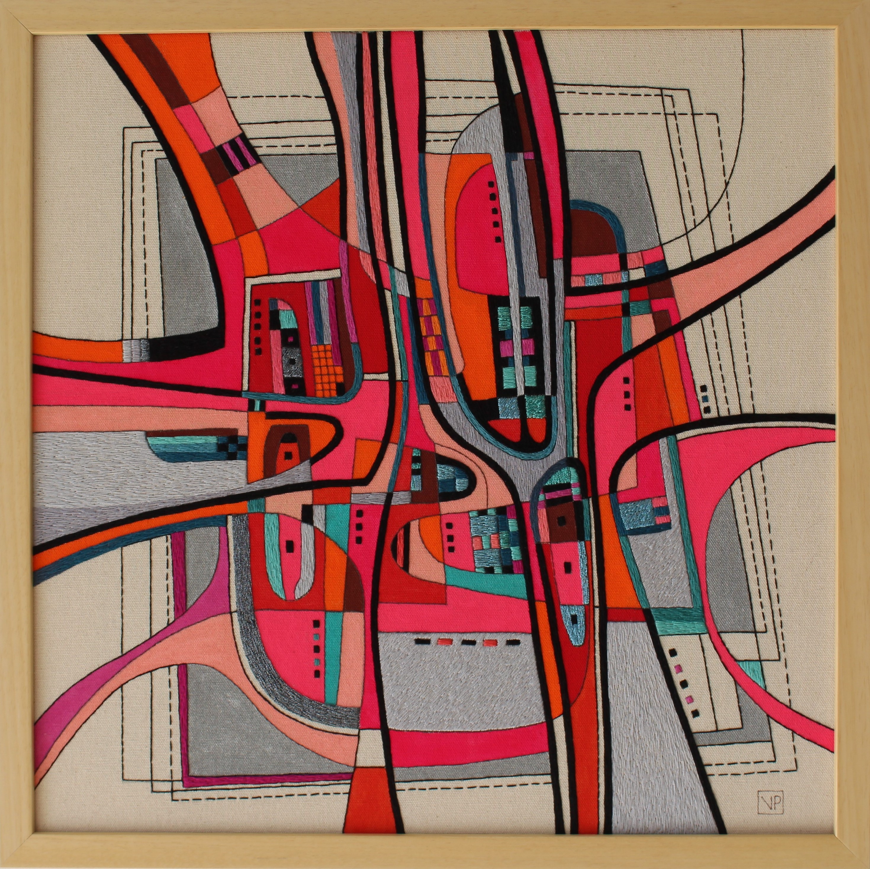 Fiber, hand embroidery, cotton, rayon and metallic threads, canvas on wood stretcher bars. 18x18 in.