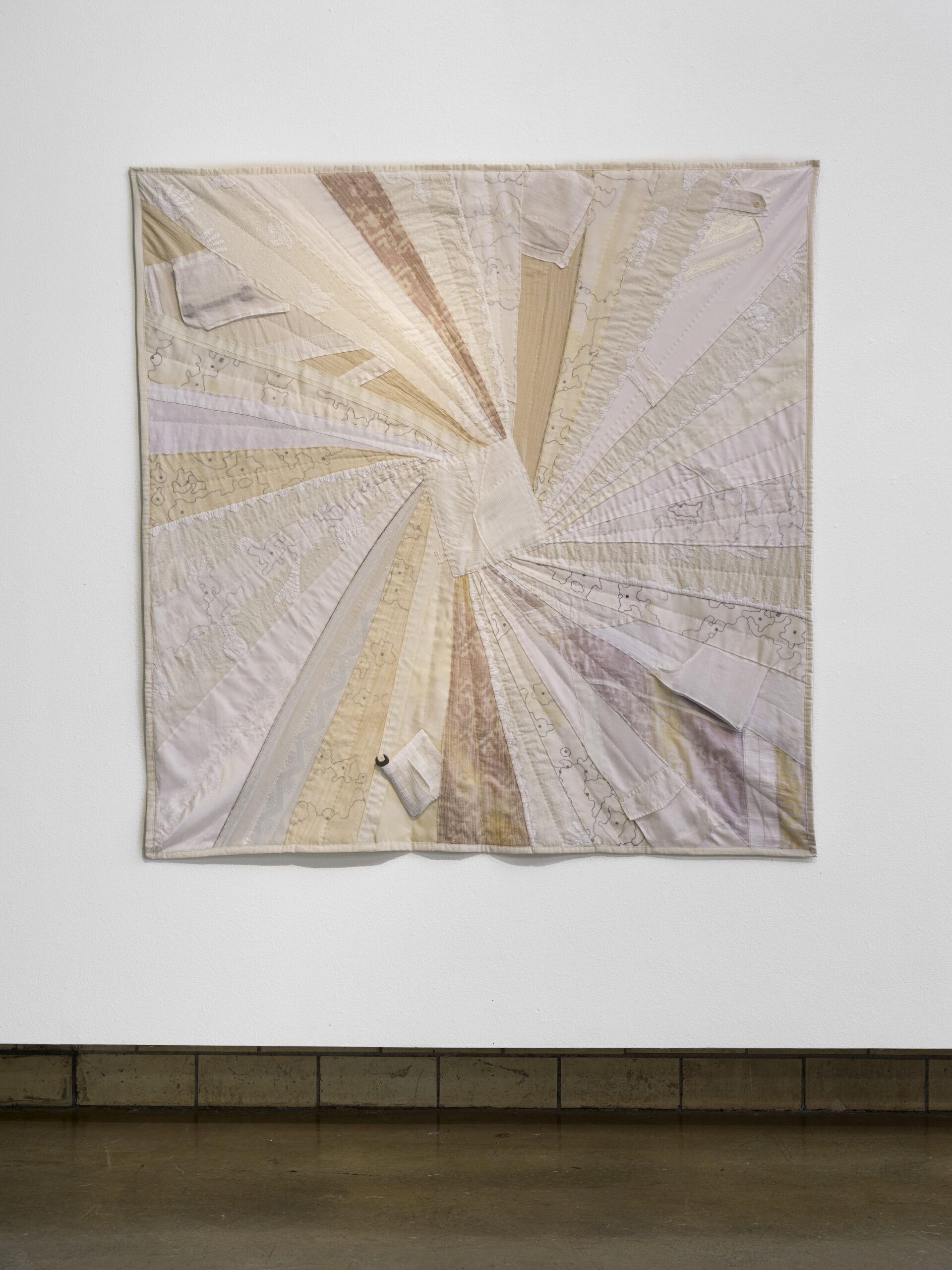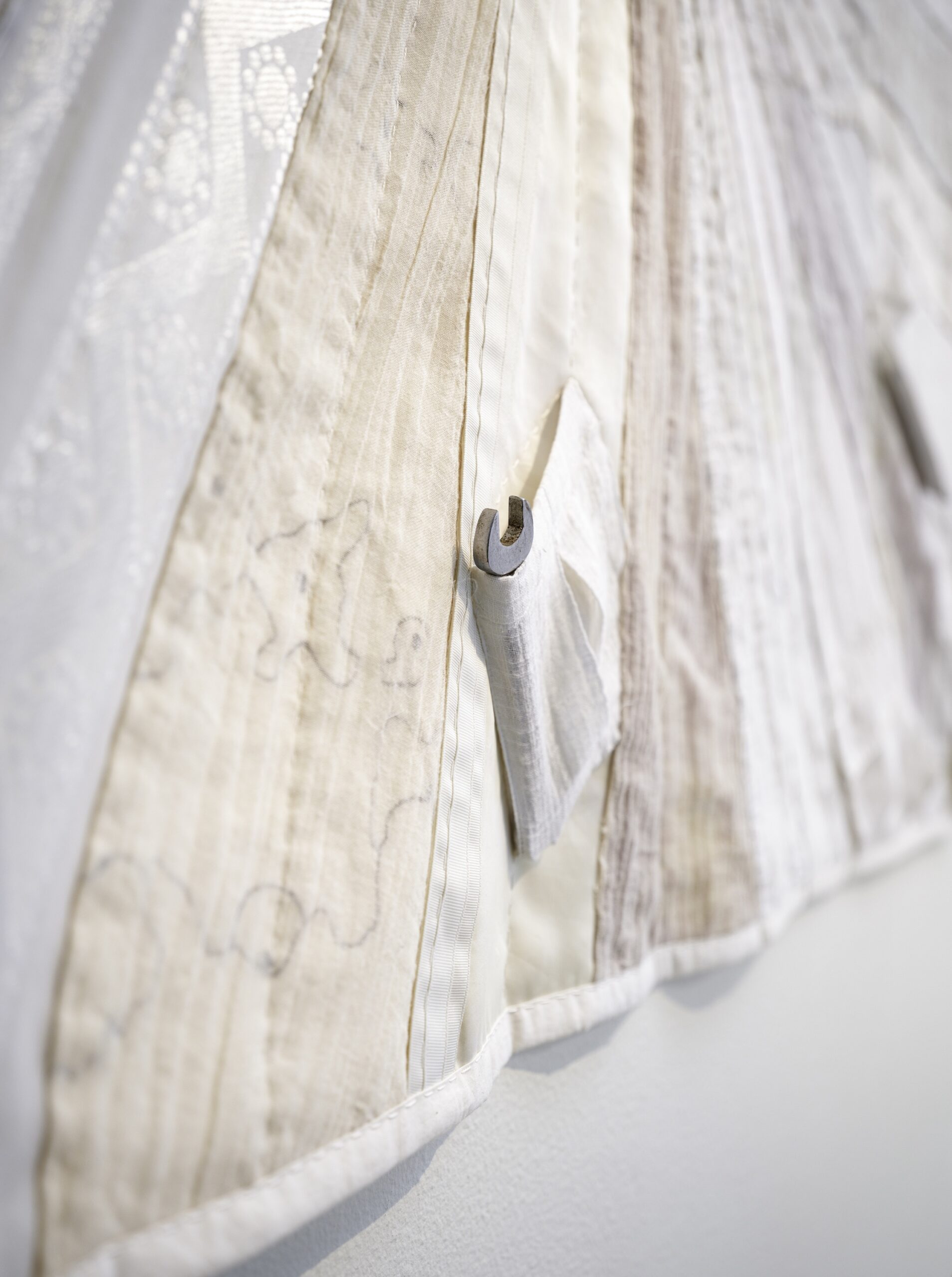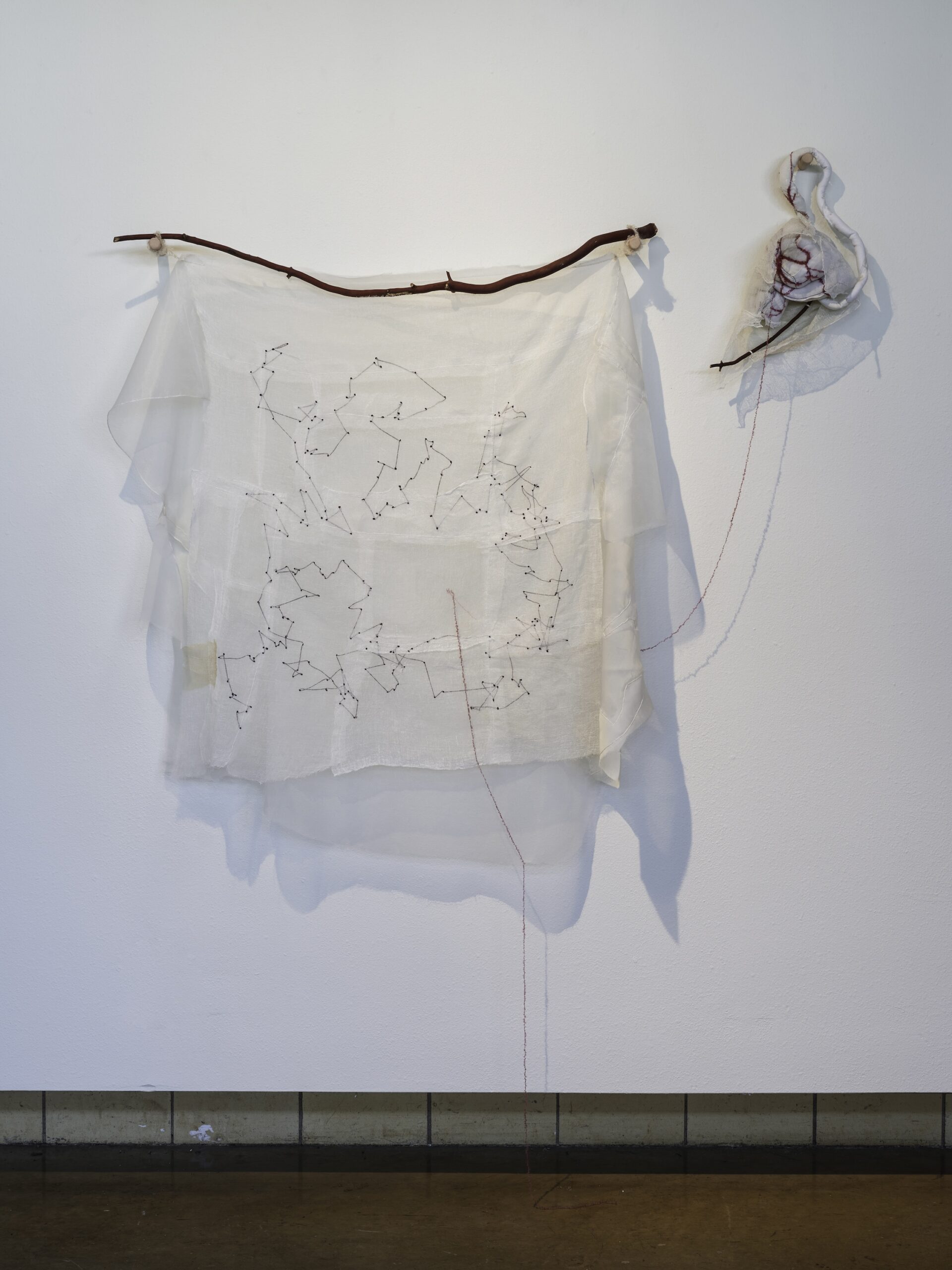 Hand-stitched textile made from wedding dress of artist’s second marriage, avocado-dyed cheesecloth, cotton thread, Pacific North- west Madrone, cochineal-dyed yarn (French knots mark each gesta- tional day of artist’s last pregnancy) 86” x 64”