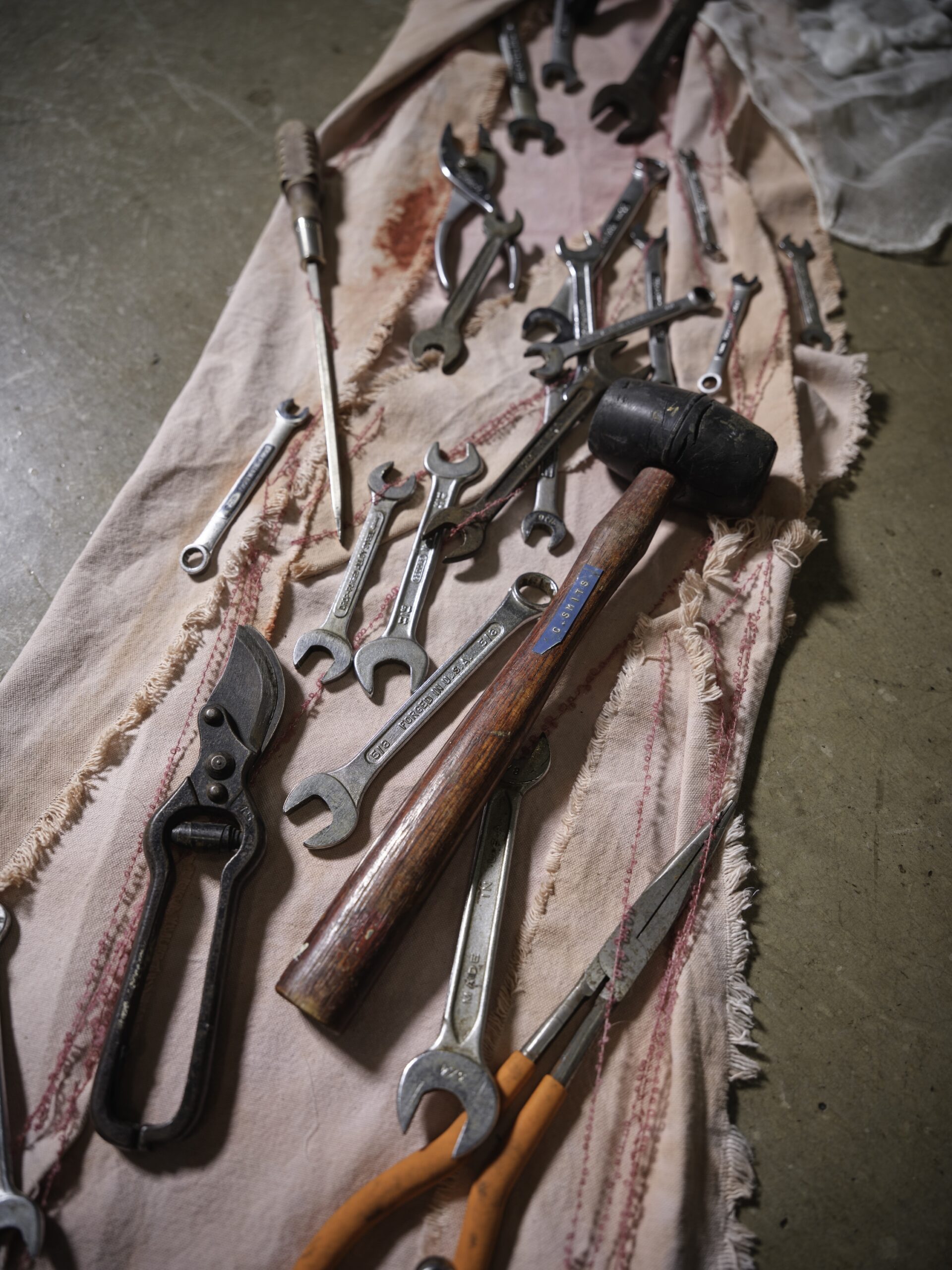 A Softer You is a collection of eight hand-stitched contours of my father's tools and is part of a larger body of work exploring the impacts of insecure attachment. The tools function as reinvented iconic symbols marking the initial imprint of insecure attachment and how understanding creates opportunities for transformation. While it is impossible to dissect the intricacies of my or anyone's attachment experience in a short explanation, my father's tools throughout childhood were a symbol of his attachment style: they were ordered in neat, classified rows on a pegboard in his workroom and when one disappeared or was out-of-place, he verbally and emotionally ruptured and created fear. These diminutive versions of my father's tools offer regeneration: what if these tools, symbolic of fear, were accessible? What if their identity were reinvented toward engagement and warmth?