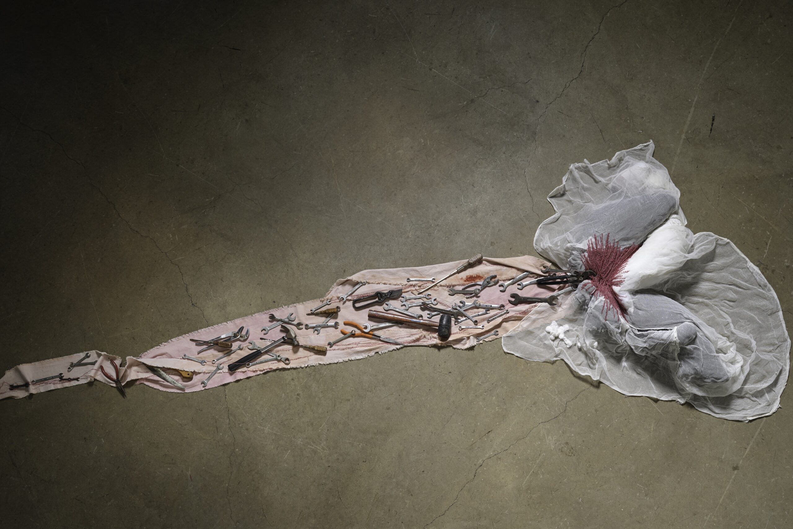 Artist's father’s tools, cochineal-dyed canvas and wool, cheesecloth, various textiles 10’ x 2.5'