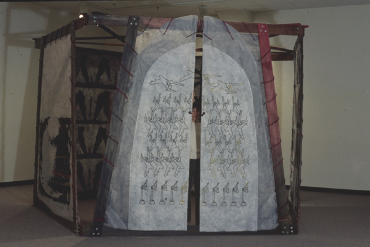 Textile paint printed on polyester spunbound non-woven fabric, sisal dyed with fiber reactive dye, poplar, hardware. 8' x 13' x 13'