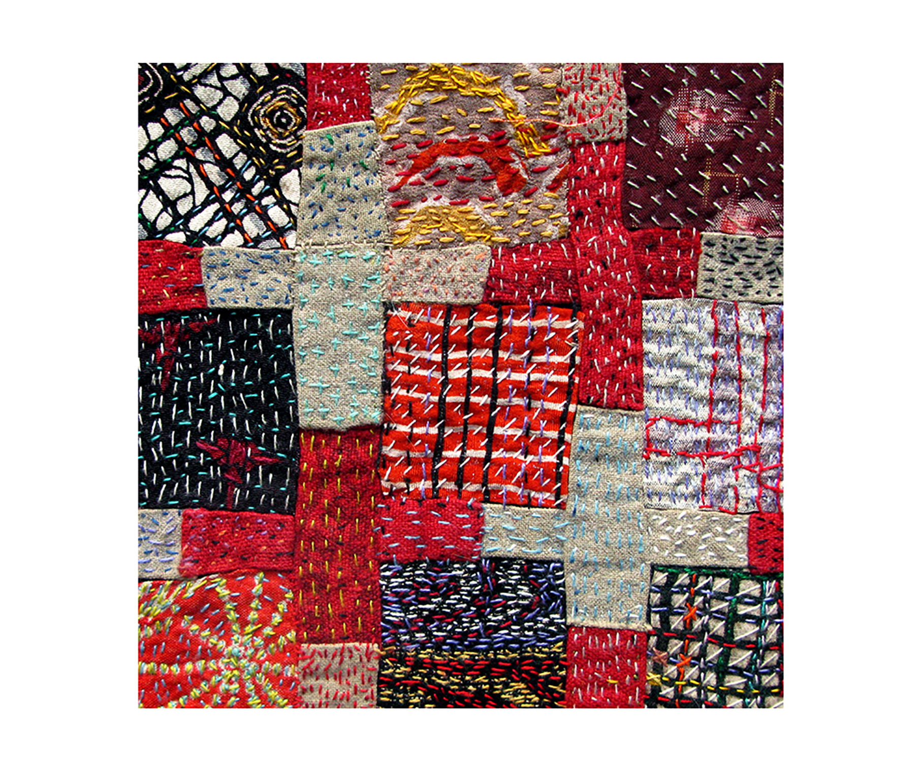Salvaged textiles: scraps of old skirts and a friend’s discarded shirt, vintage kimono silks, ribbons, backing of an antique quilt, a piece of upholstery from my first couch 10" x 10"