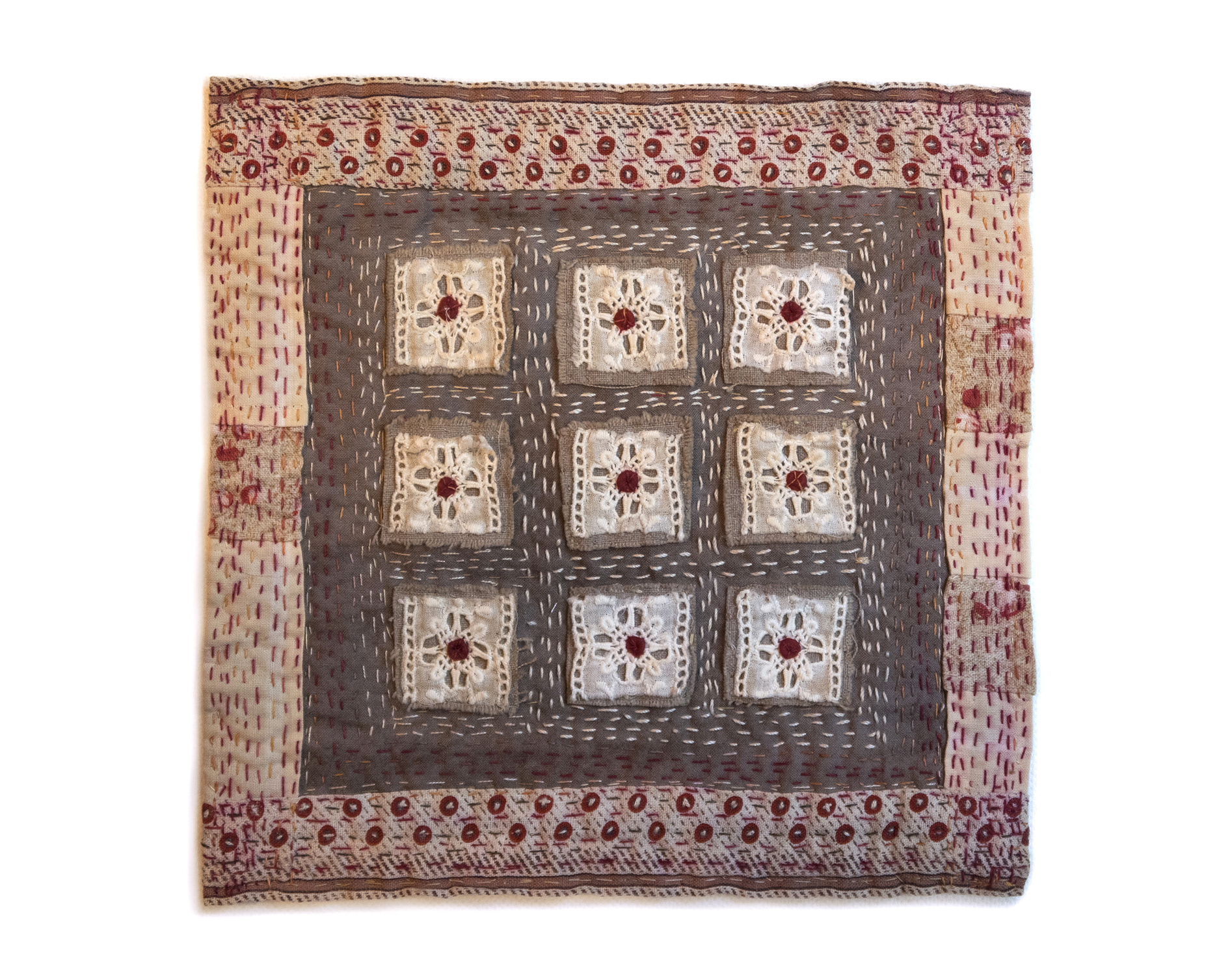 Cotton salvaged from a ragged antique quilt, vintage lace, repurposed linen clothing, and tiny beads. 6.25" x 6.25"