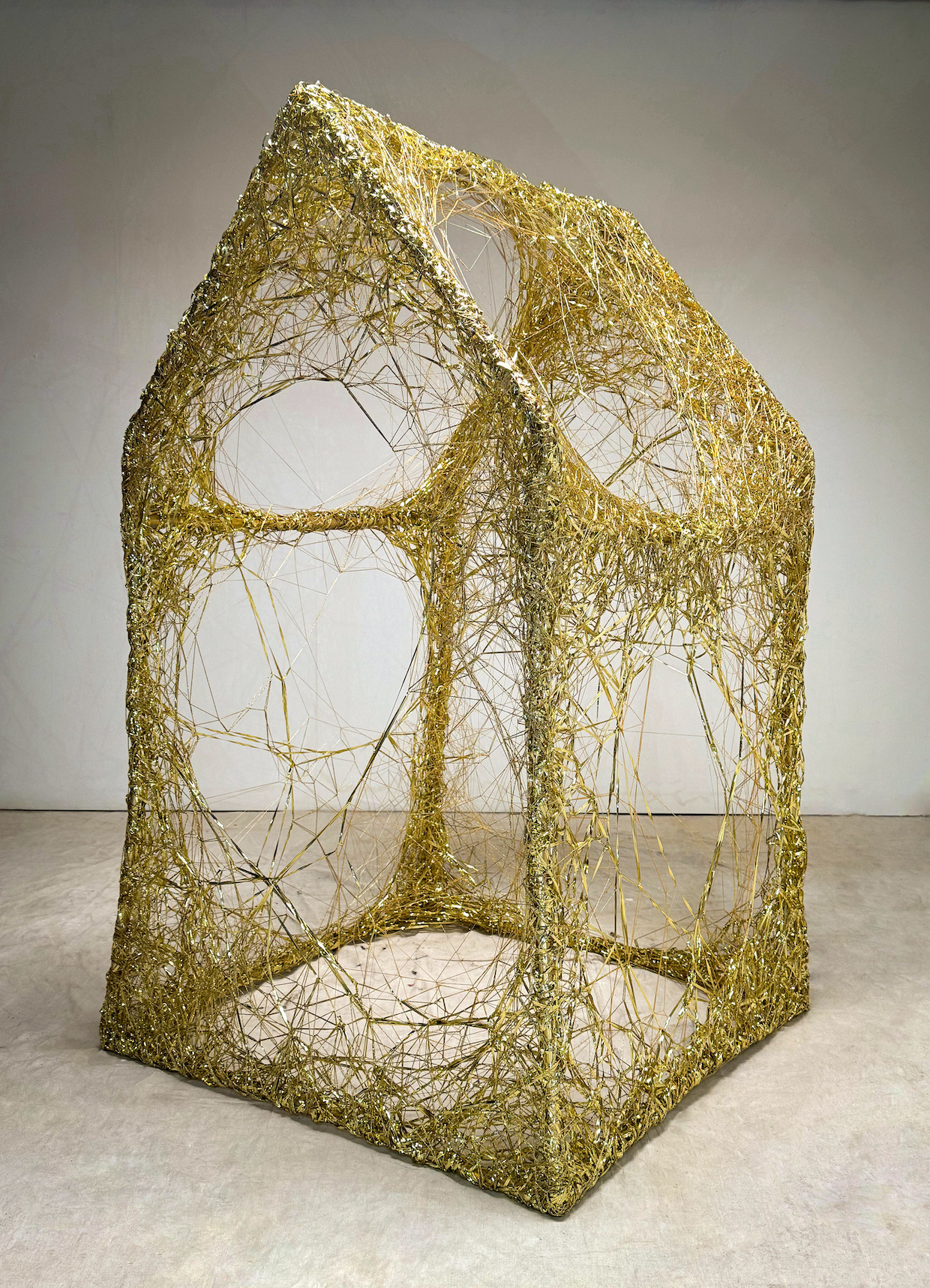 repurposed greenhouse, metallic thread, gold garden wire 59 x 36 x 36 in.