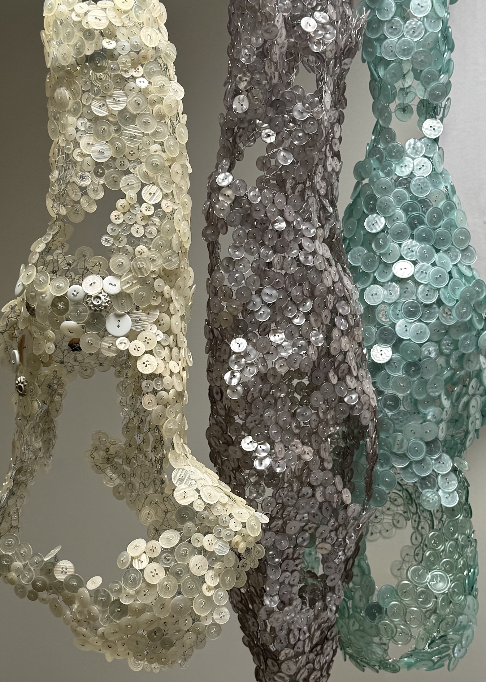 Composed of thousands of iridescent, hand selected buttons, these suspended kinetic sculptures pay homage to my Grandmother’s sewing box and were initially inspired by the intricate architecture of beehives. These organic, floating forms are designed to accentuate the inherent beauty and understated elegance of everyday objects, such as the button, which is rich with aesthetic and functional significance.