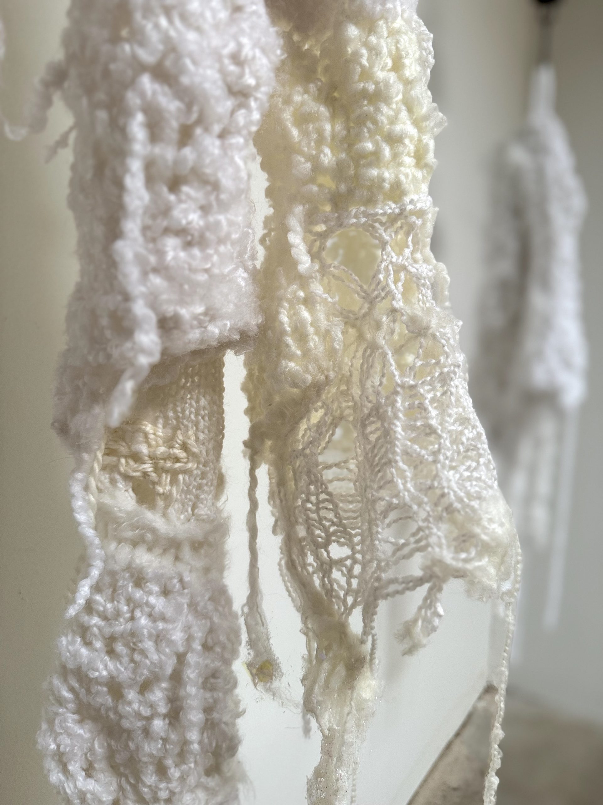 Year by Year (detail image shown) is a sculptural installation, fiber based piece. Each fiber sculpture is a representation of a distinct year of life. Celebrating joyous occasions, recalling sad times, these are conveyed by the specific materials used in the pieces. Some, for example, have bits of sparkle while others contain twisted knots and loops. Some are smooth and satiny, while others appear visually rough and coarse. The pieces range in size, also as a way to show how the perception of time is always changing."