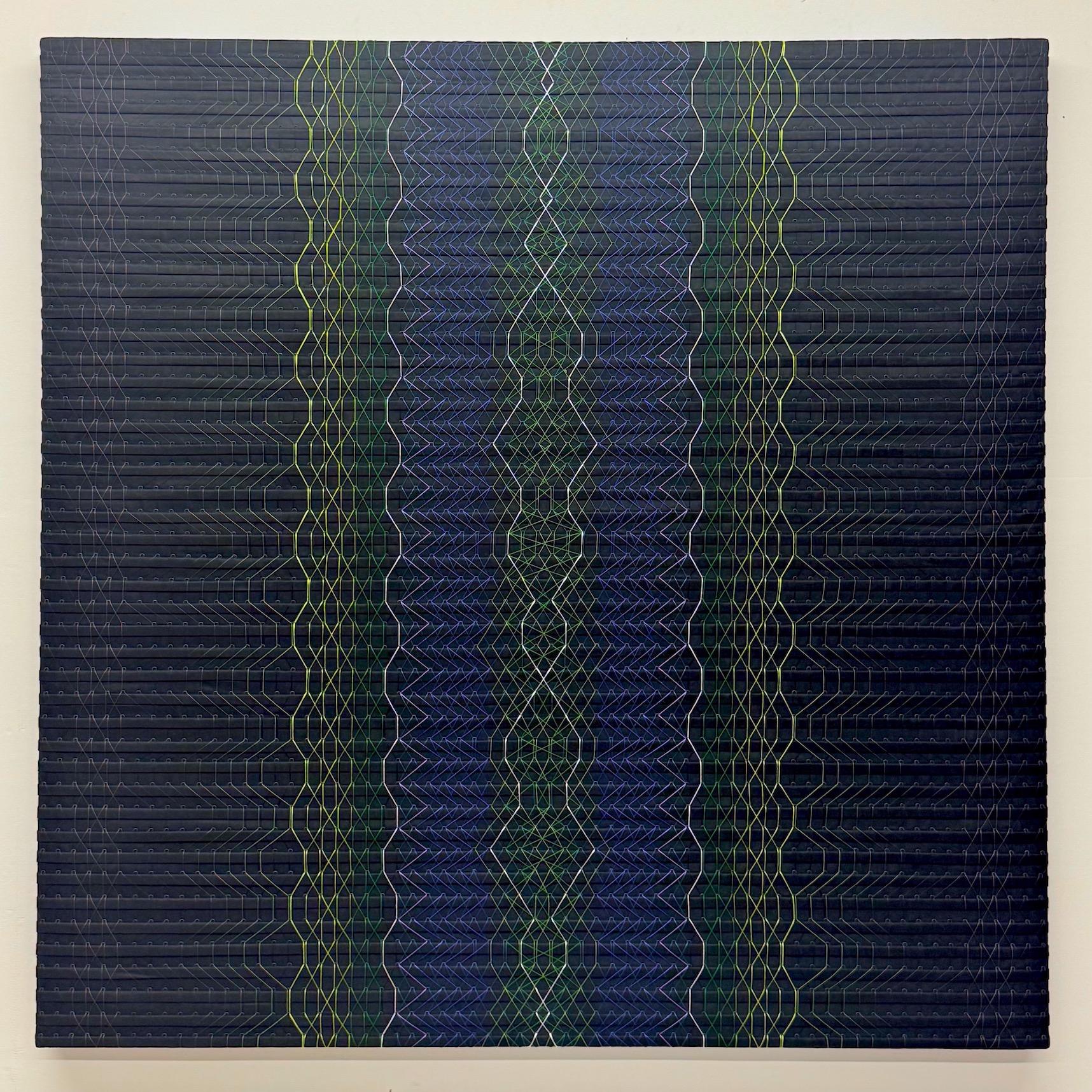 NOCTIFLOROUS, is a 48 x 48 x 3 inch fiber-based artwork composed of fabric, eyelets and a range of threads, including embroidery threads of varying colors and thicknesses. Inspired by the delicate and sacred nature of night-blooming flowers, the piece explores themes of fragility, transience, and meditative presence. The work investigates how subtle shifts in thread color and density can create a sense of depth and spatial movement. Beginning at the center, I stitched outward through repeating patterns toward the middle and then the outer edges. As the threads gradually shift in hue and become finer, they begin to fade—echoing the fleeting beauty of a night bloom and the impermanence of life itself.