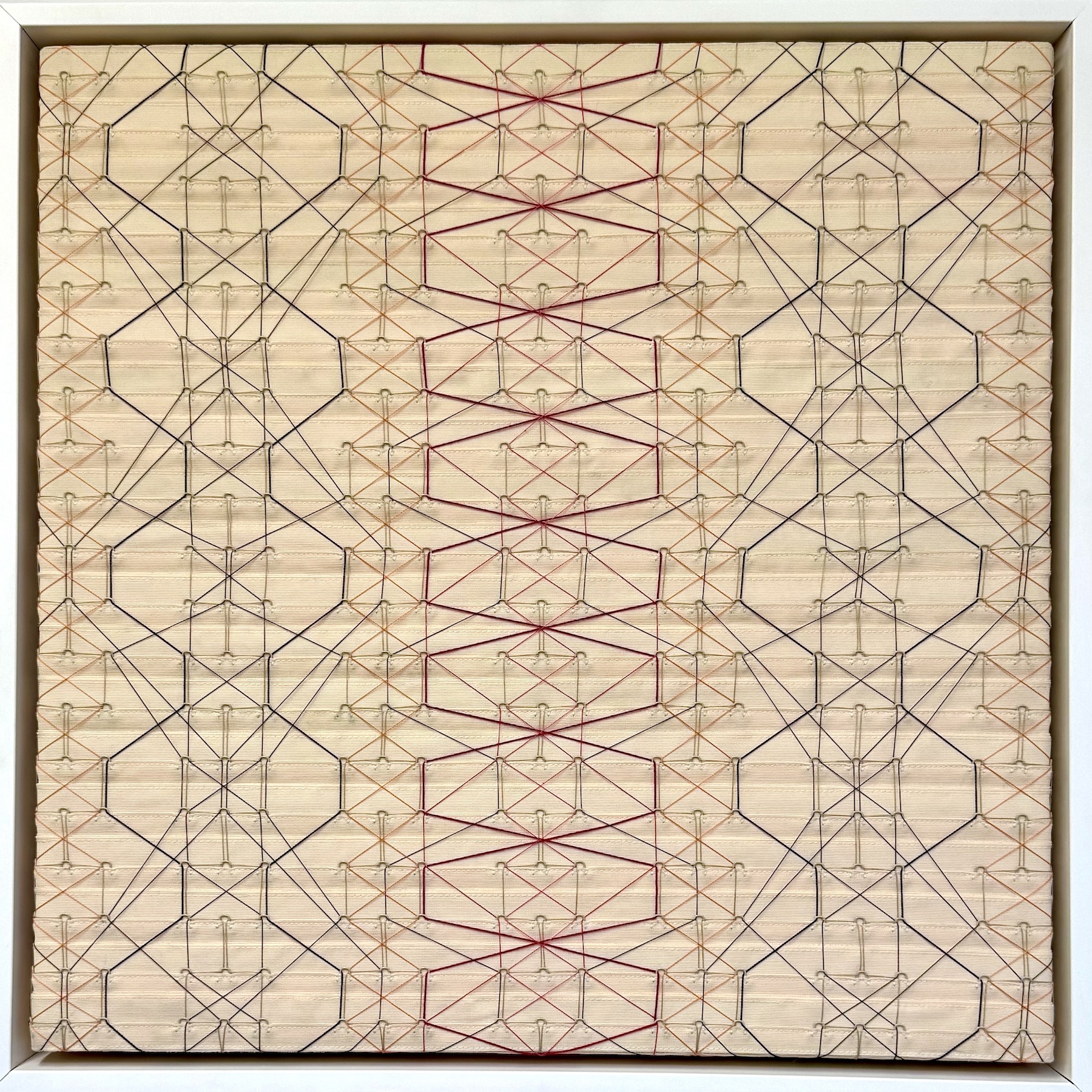 fabric, eyelets, thread varieties, on wood 48 x 48 x 2 in.