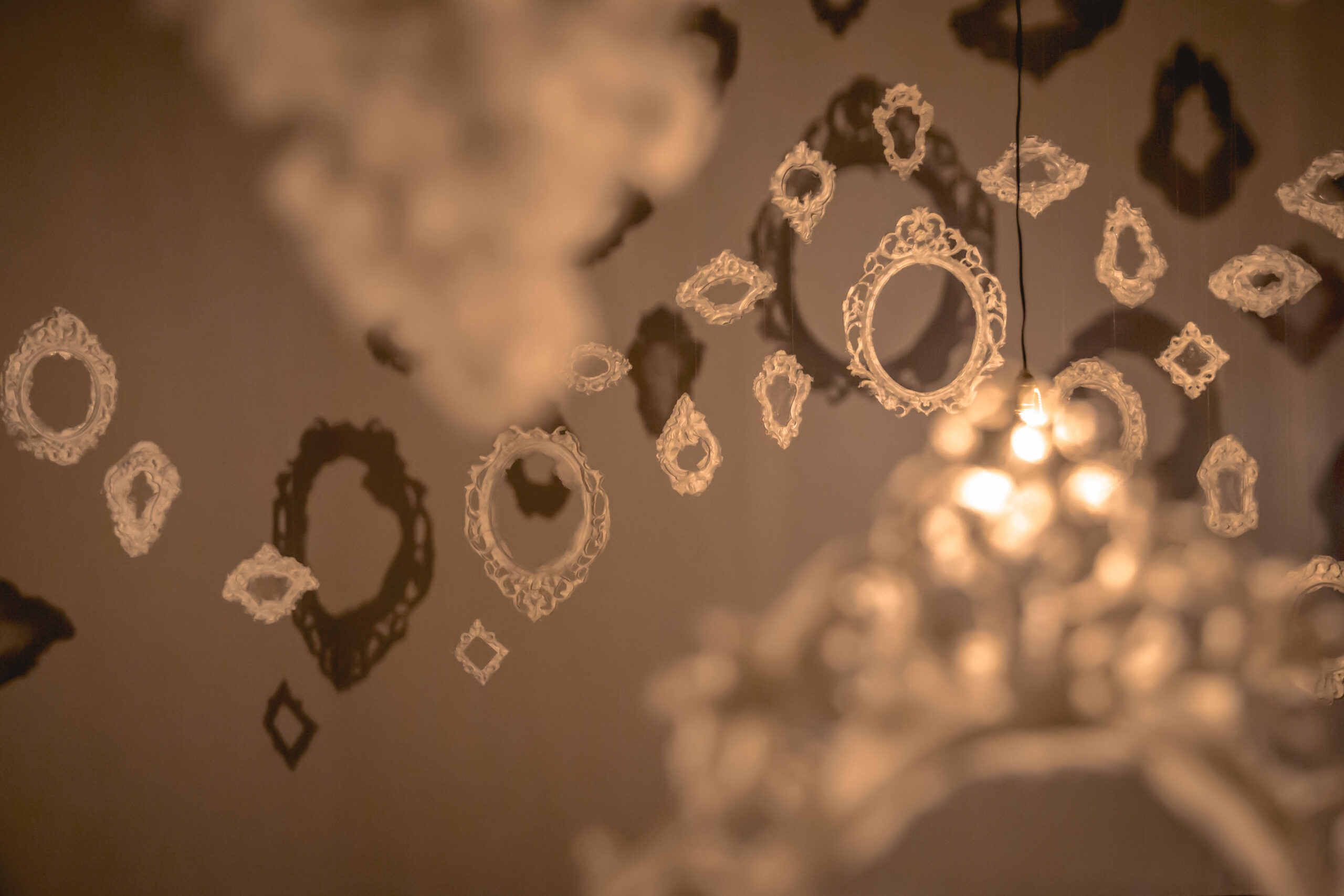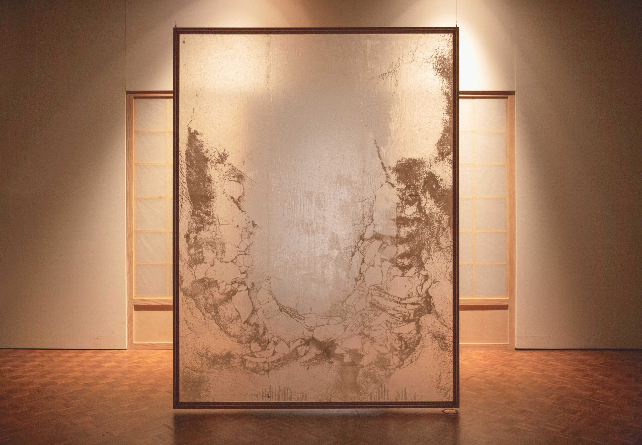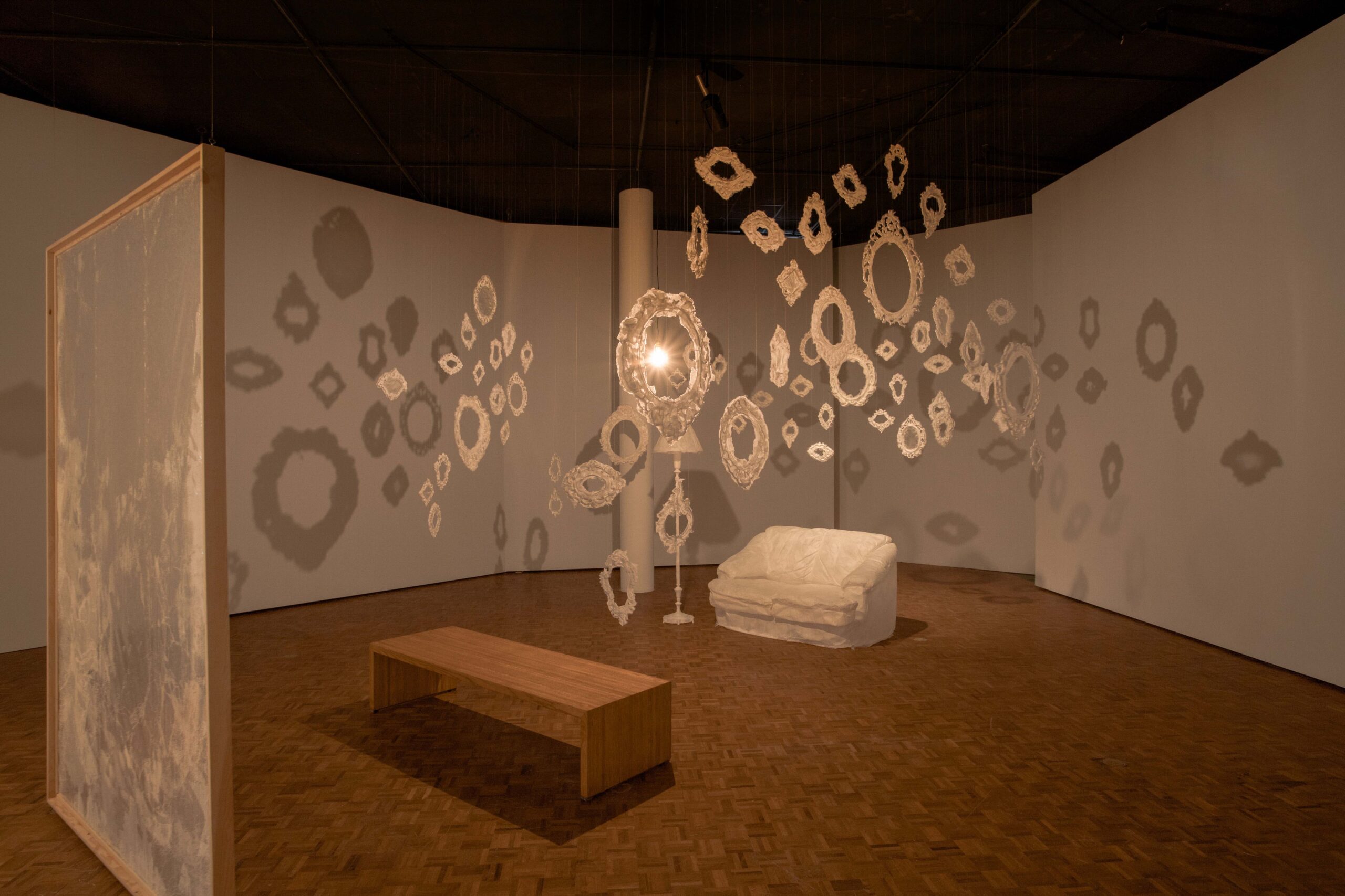 washi, wood, polymer, glue, thread installation in 35' x 35' x17' space